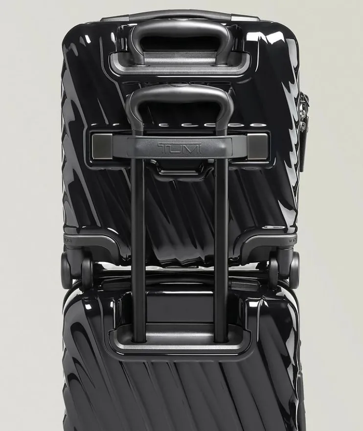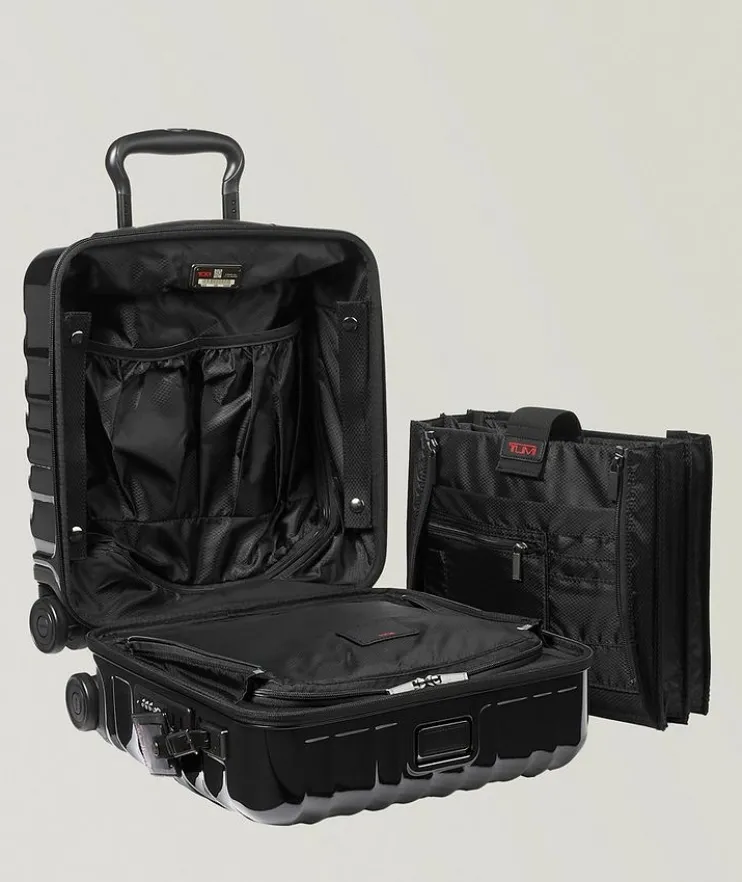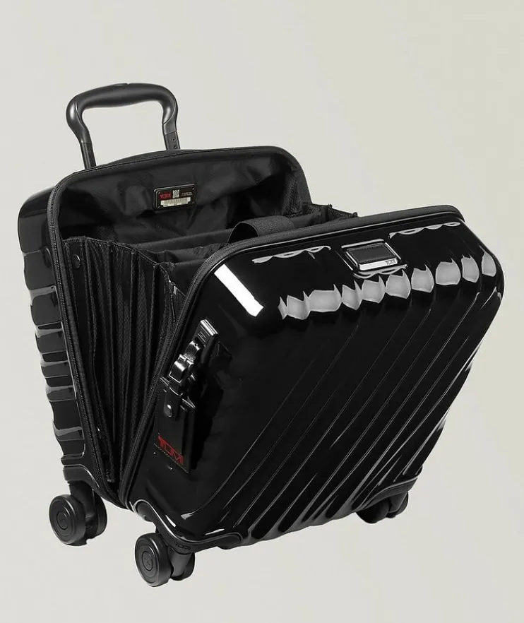 - This striking four-wheeled briefcase boasts a modern silhouette with fluid-looking, angled lines. Made with a recycled polycarbonate shell, its lightweight and flexible, yet still durable. The compact size is designed to fit under the seat on most airlines, while the four-wheeled system offers quiet and effortless maneuverability in every direction.