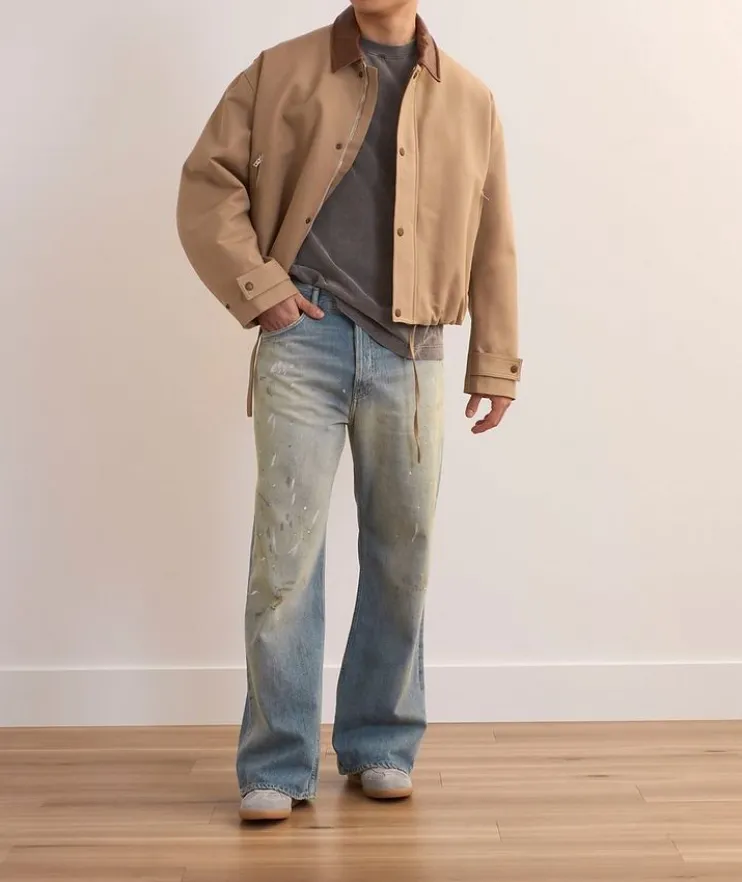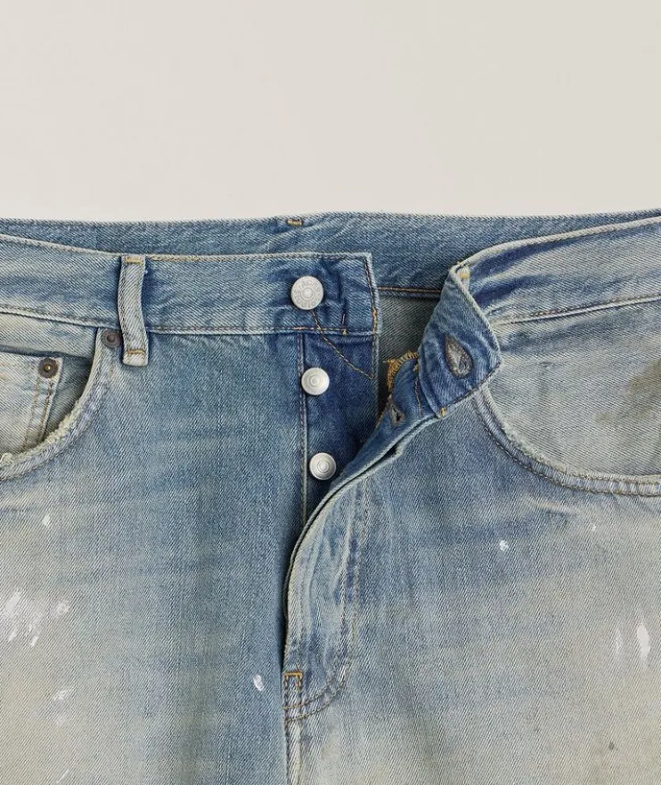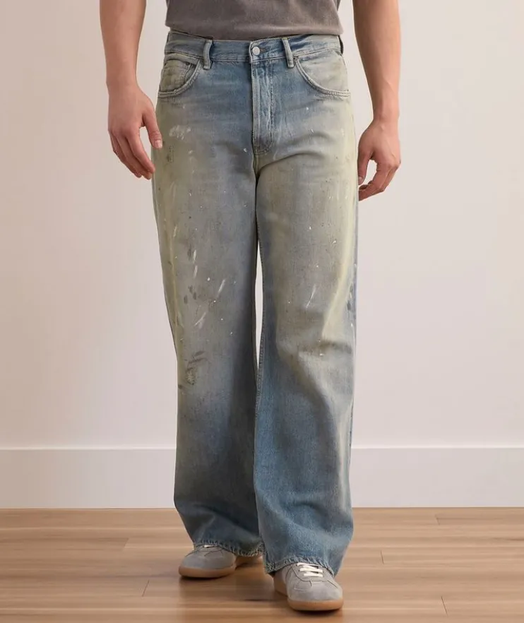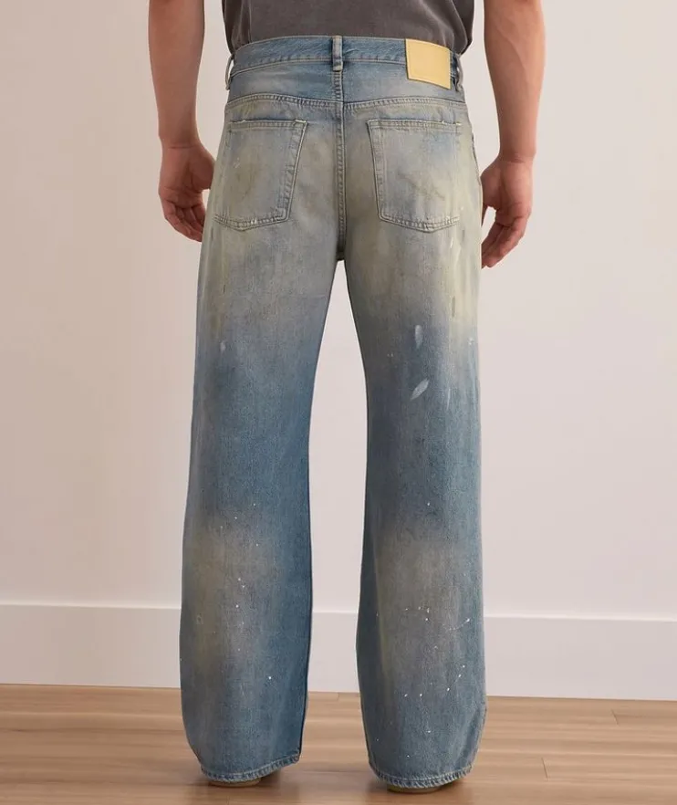 - Made for your streetwear edit from rigid, mineral-tinted organic cotton denim, these jeans are distressed to create an authentically lived-in look. Cut for a relaxed fit with a mid-rise, wide leg and long length, this style is detailed with paint splatter for a unique urban finish.
