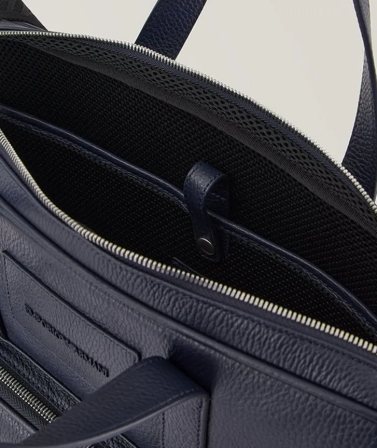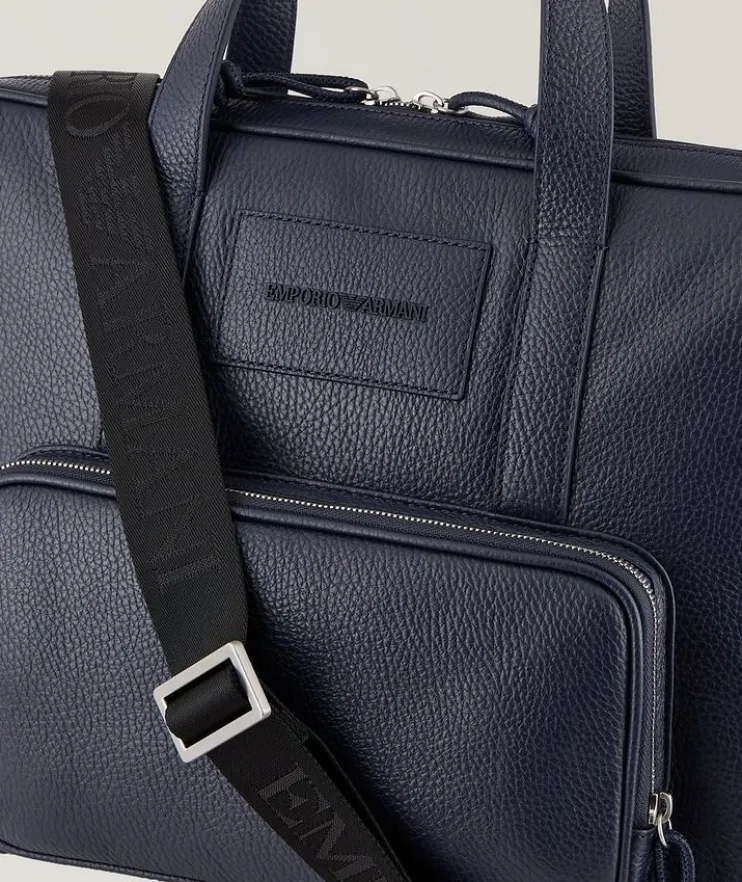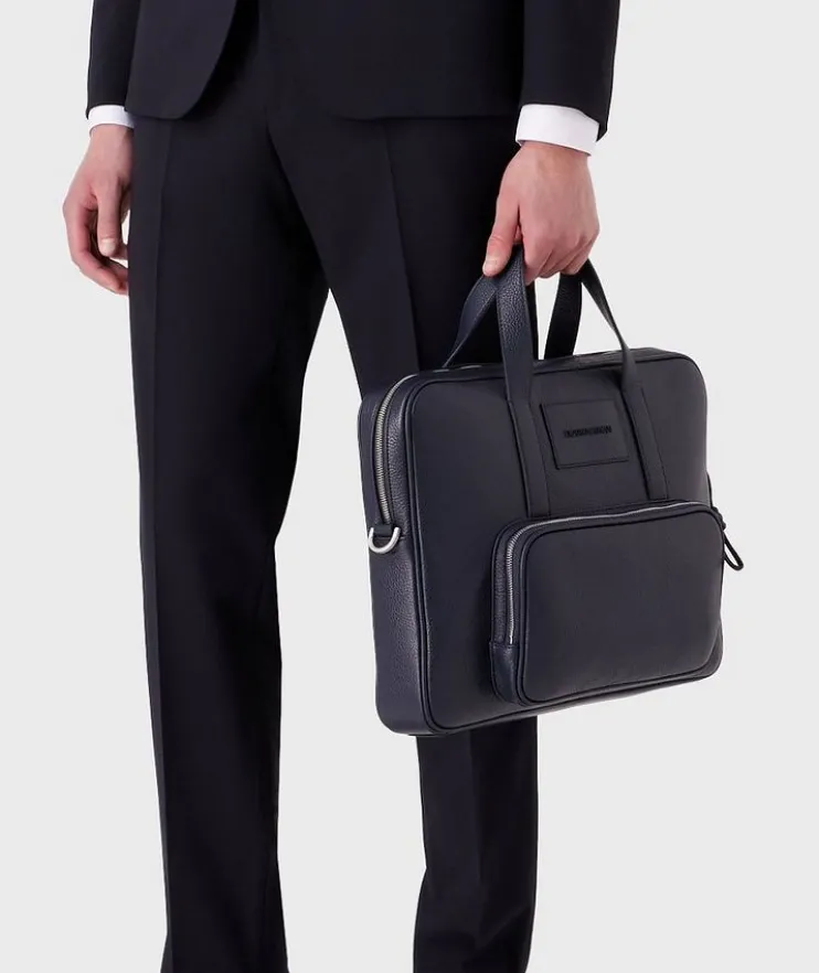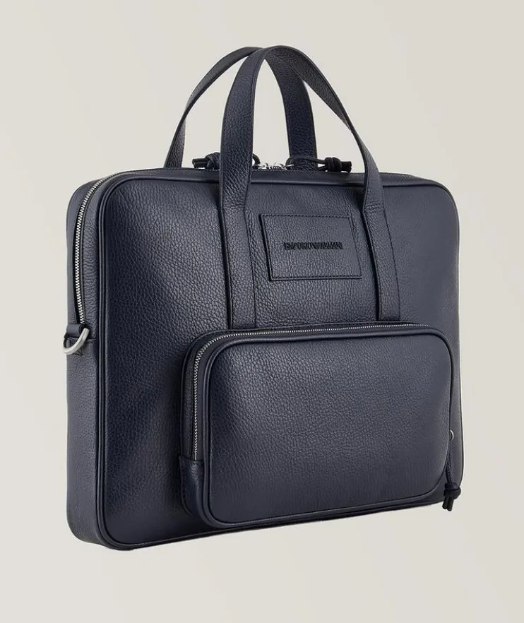 - Designed to be ultra-sophisticated and versatile, this briefcase from Emporio Armani is the perfect, timeless accessory for all your business needs. The extremely soft tumbled leather style is finished with a monochromatic leather patch with 3D rubberized logo lettering to complete the suave accessory.