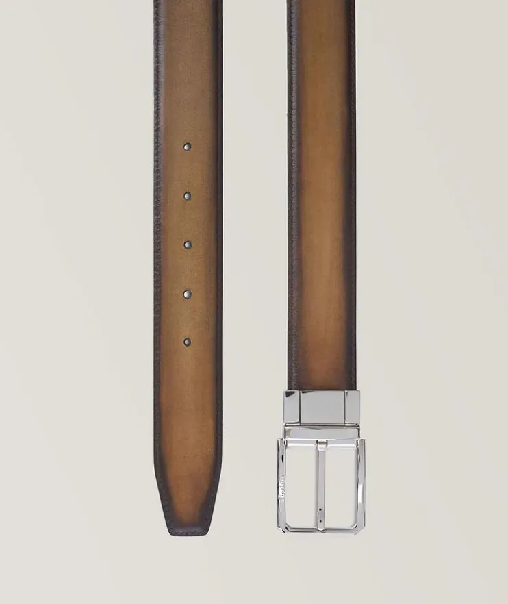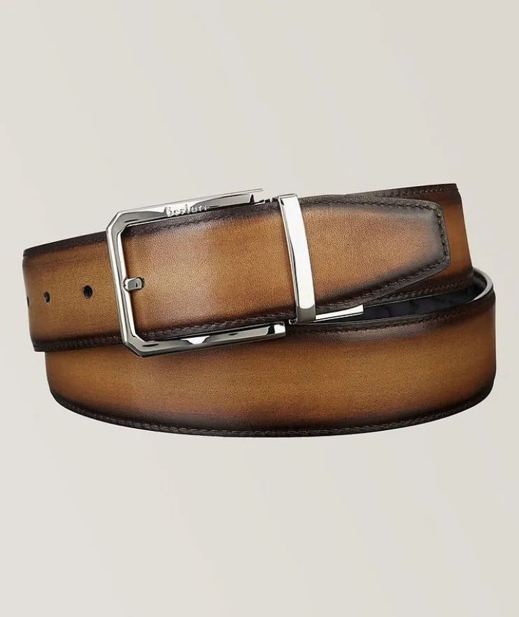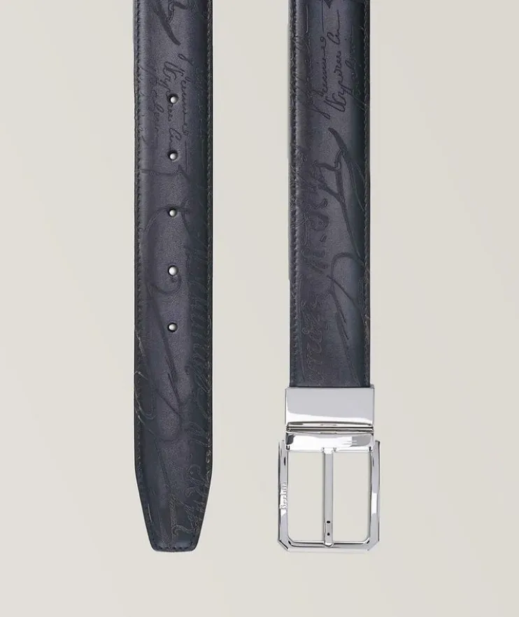 - Berluti relishes leather craftsmanship that extends beyond just aesthetics and quality construction — it’s rooted in the philosophy of hard work. The Versatile belt, a wardrobe staple from the French house, is a reversible style composed of their Venezia calfskin — one side dons the signature Scritto engravings in Tobacco Bis, while the other is finished in patinated Nero. Featuring a timeless and distinctive double bridge brass buckle, it’s an unerringly masculine design that is sure to outlive the others.