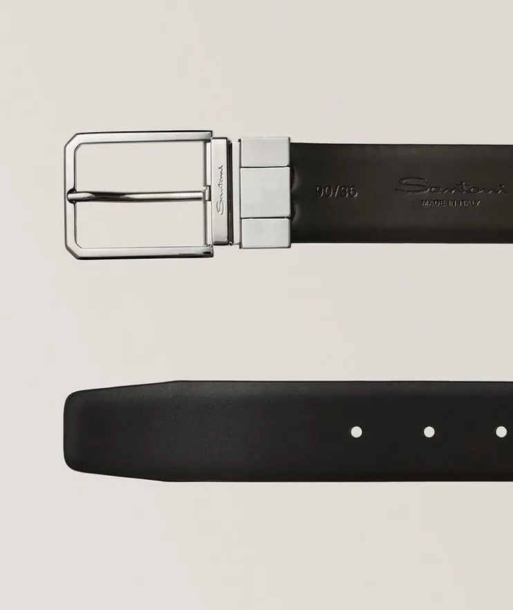 - This reversible men’s belt is crafted from premium-quality leather and can be adjusted and fastened using the elegant square metal buckle. We recommend selecting one size larger than your trouser waist size to ensure that the buckle comfortably fastens in the middle hole.