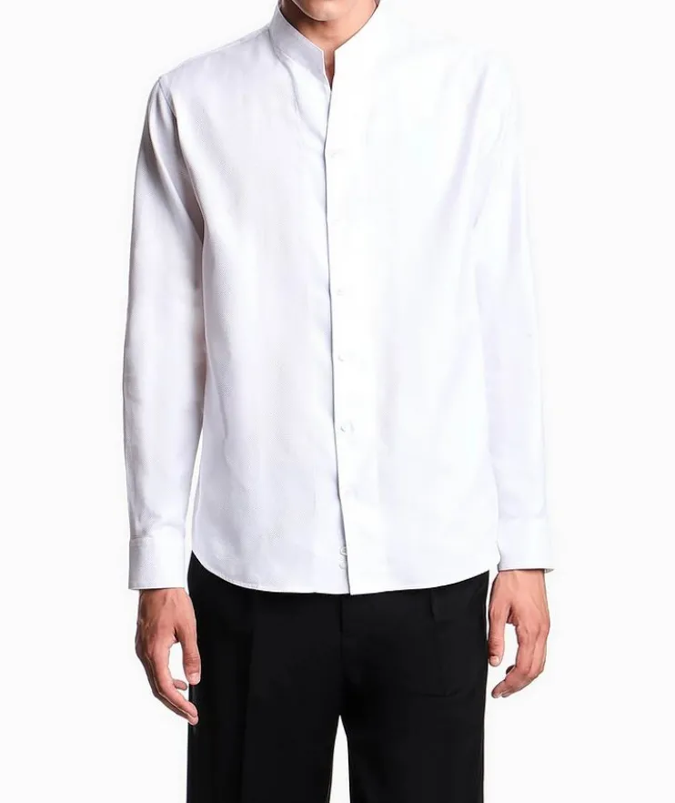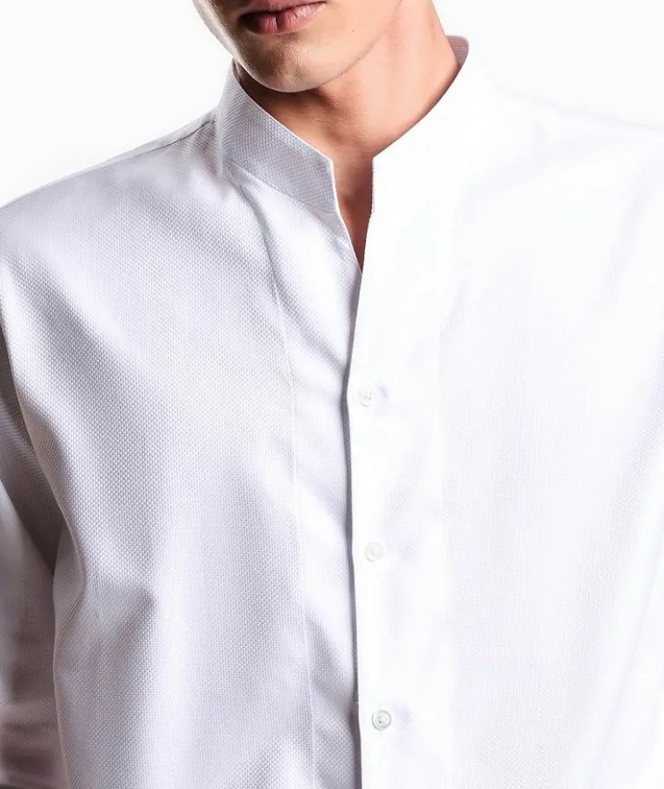 - Simple and effortlessly refined, this modern dress shirt with guru collar is topped with an armure weave that creates an exclusive monochromatic micro-pattern for a sophisticated finish.
