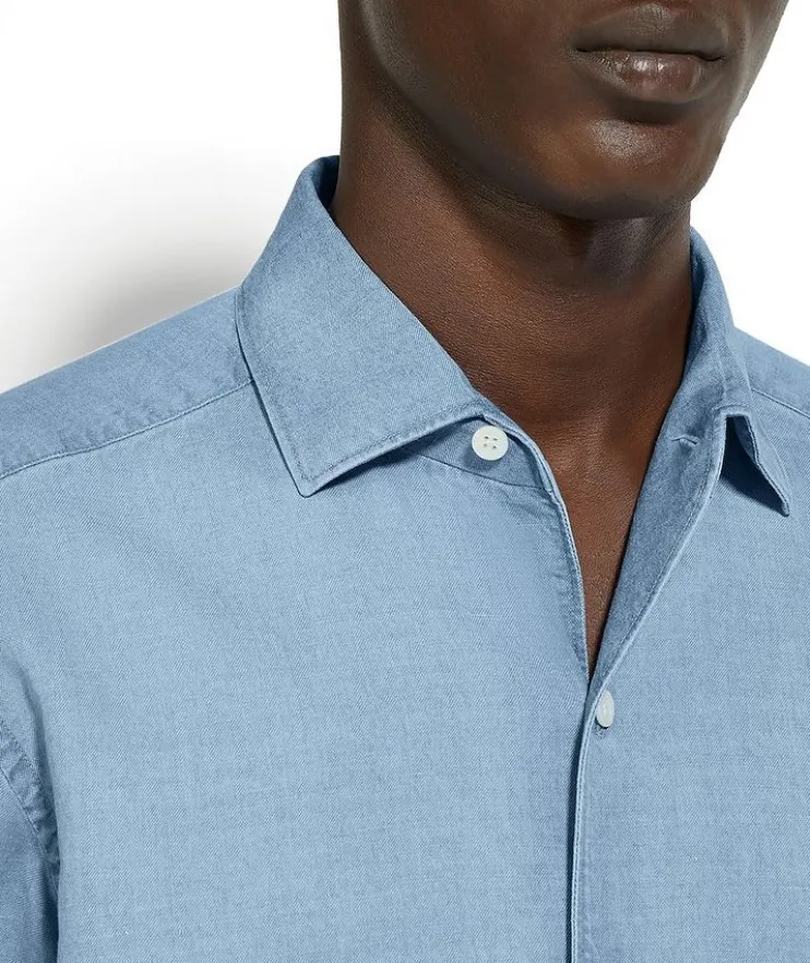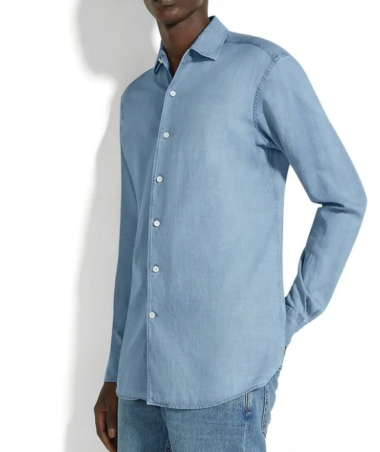 - This long-sleeve shirt puts a breezy spin on classic denim, blending cotton with a hint of linen. Styled with standard cuffs and a versatile rounded hem, this wardrobe staple presents a bleached finish for effortless charm.