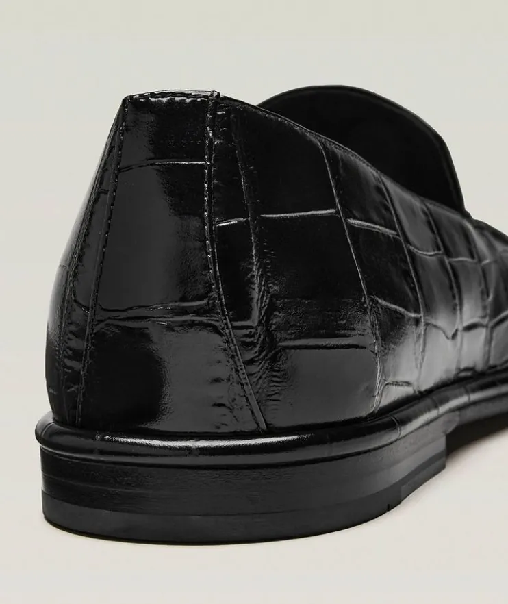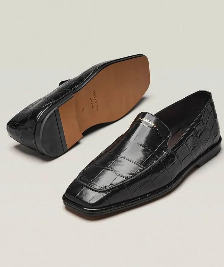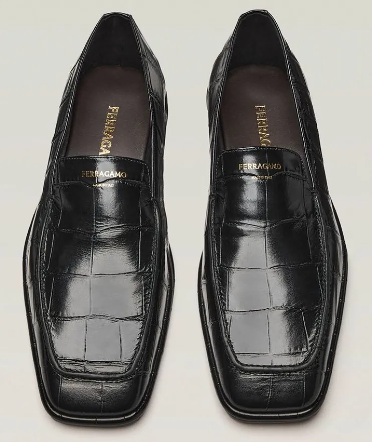 - With clean lines and minimal details, these square-toed loafers are finished in croc-embossed calfskin leather. These loafers have been crafted with a wider/EE width. Consider selecting a full size down for a standard fit.