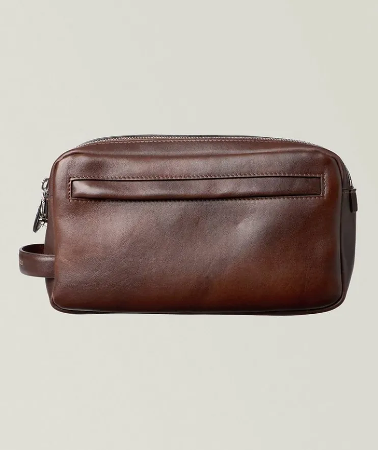 - A combination of function and style, this burnished leather toiletry bag with double-zipper closure comes equipped with a spacious main compartment and zippered pockets for additional storage.