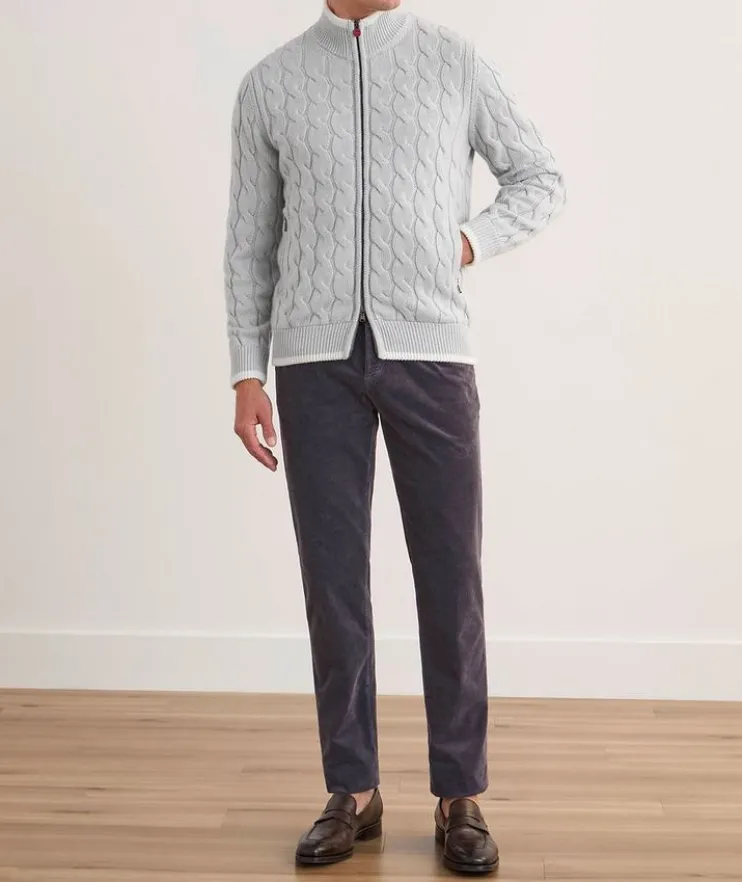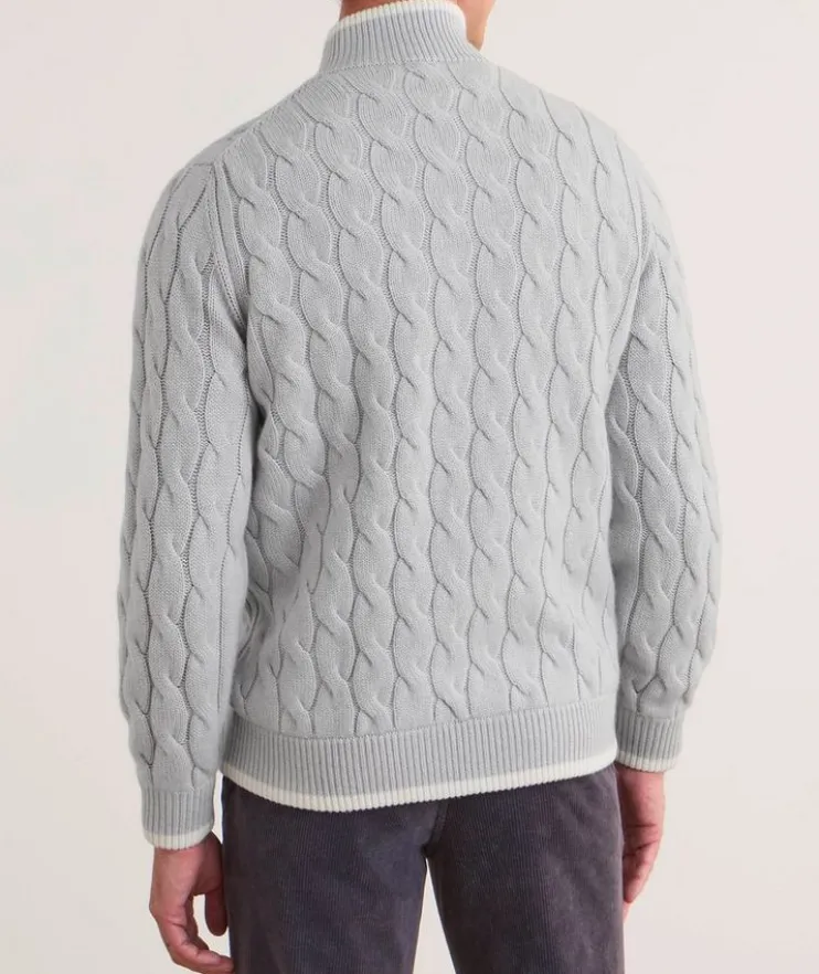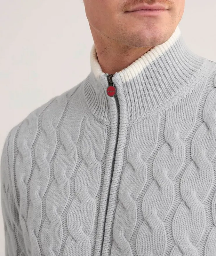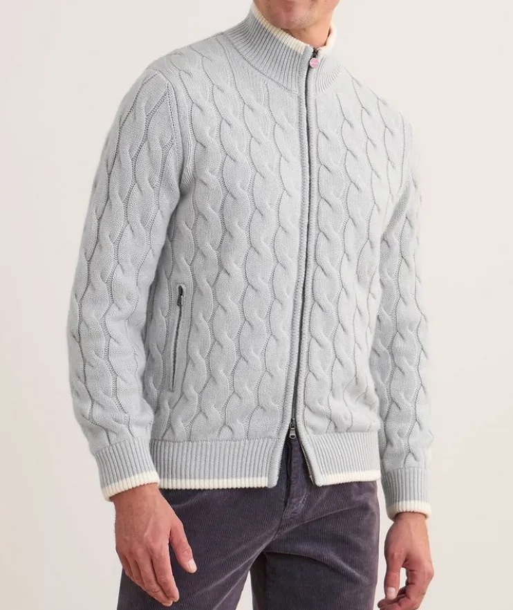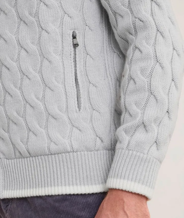 - This beautifully crafted cardigan mixes classic and modern details to create a functional layering piece that doesn’t compromise on style. Made from luxurious cashmere with a cable knit design, this knitwear piece is finished with a zipper closure and pockets for a modern look.