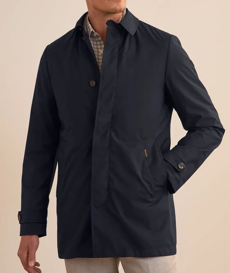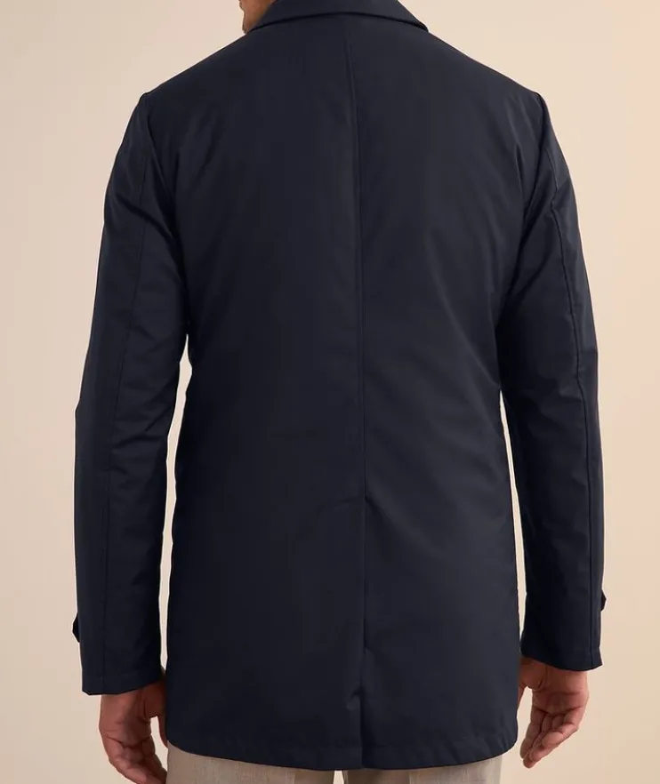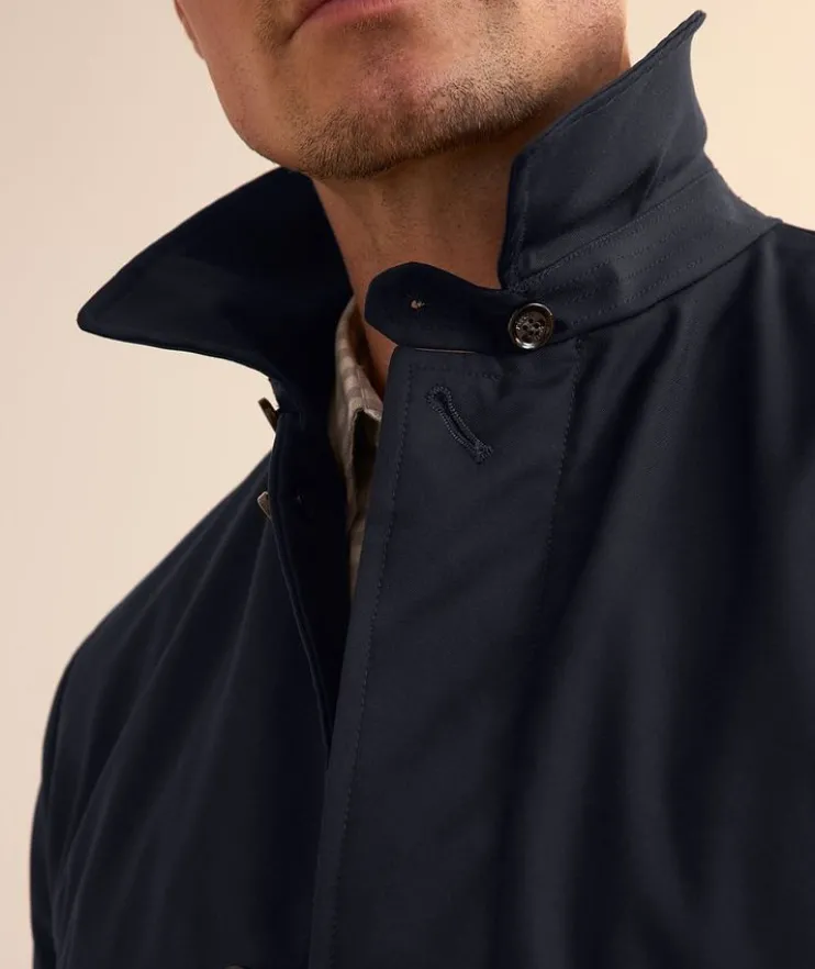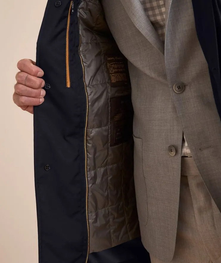 - A travel duster-coat made of crease-resistant technical fabric with a flannel-like appearance and feel, this rain jacket is equal parts functional, waterproof, and windproof. The interior is padded with soft and plush wadding and is detachable, making the trench ideal for mid-season wear and as a travel garment.