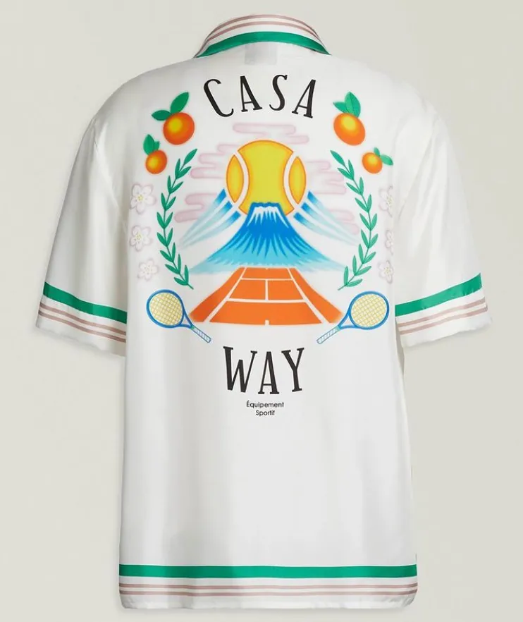 - Crafted from flowy silk twill, this short-sleeved camp shirt boasts the house’s signature artwork inspired by nature, architecture and tennis, adding a whimsical element to warm-weather dressing. Striped details add a sporty appeal to this playful shirt.