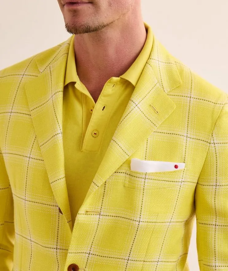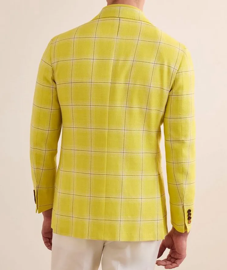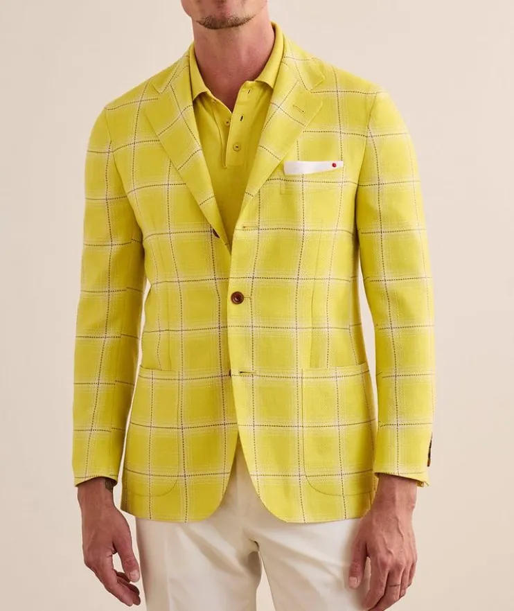 - Impeccably tailored in Italy, this single-breasted sport jacket is crafted from a fine blend of cashmere, wool, silk and linen, and is finished with a classic windowpane check design. This versatile garment is the perfect balance of relaxed elegance and sophistication, ideal for both informal and formal occasions. The sleeves of this garment are unfinished. Alterations are needed for sleeve length adjustment and button attachment.