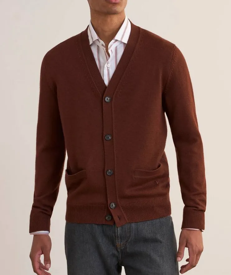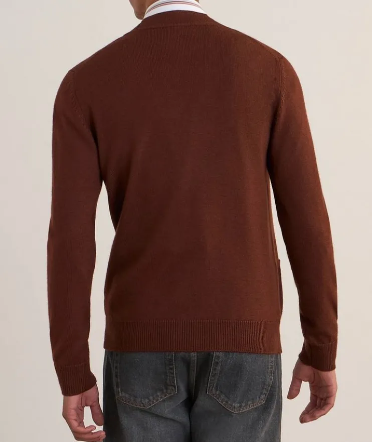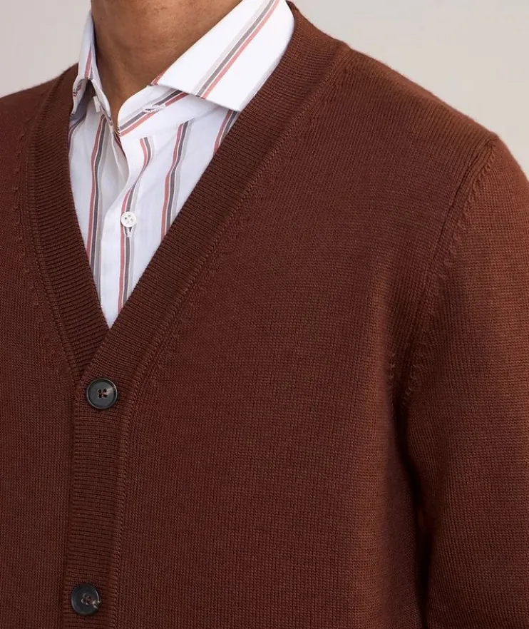 - Rendered in a luxurious blend of wool and silk, this classic button-front cardigan evokes timeless appeal and sophisticated branding with its ribbed knit trim, exquisite stitching and refined finish.