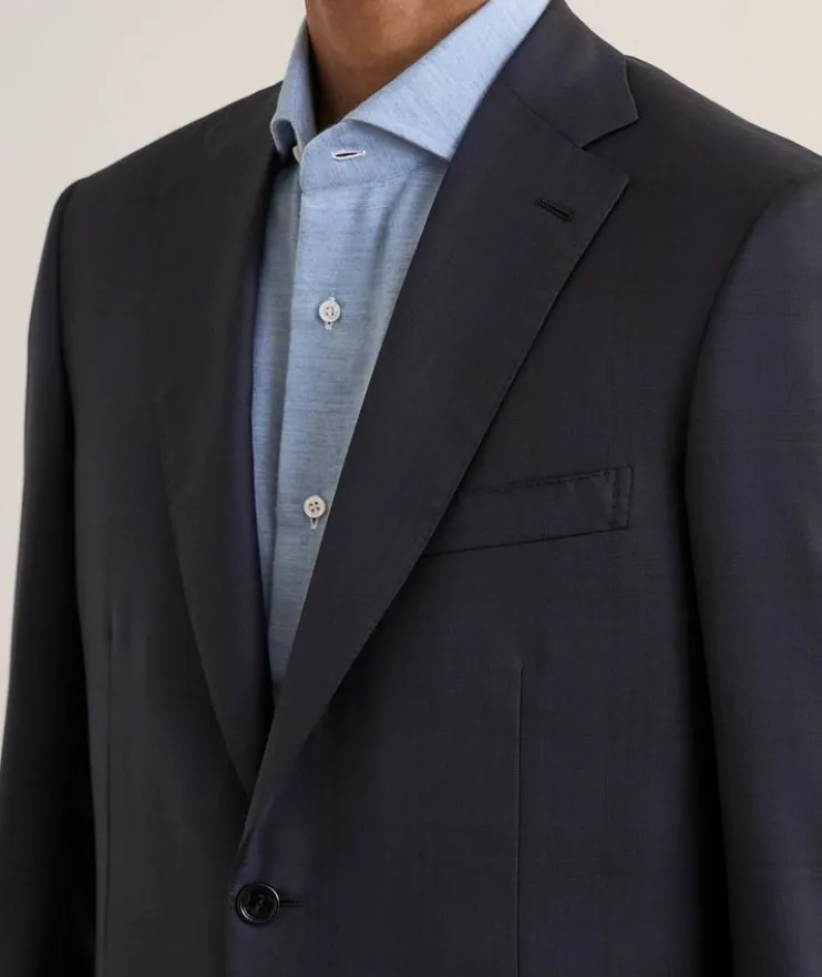 Beautifully tailored in Italy, this dapper suit is crafted from a luxe blend of wool and silk with a subtle checked design. A refined fit maintains a flattering silhouette, making this suit a timeless option for any formal affair.