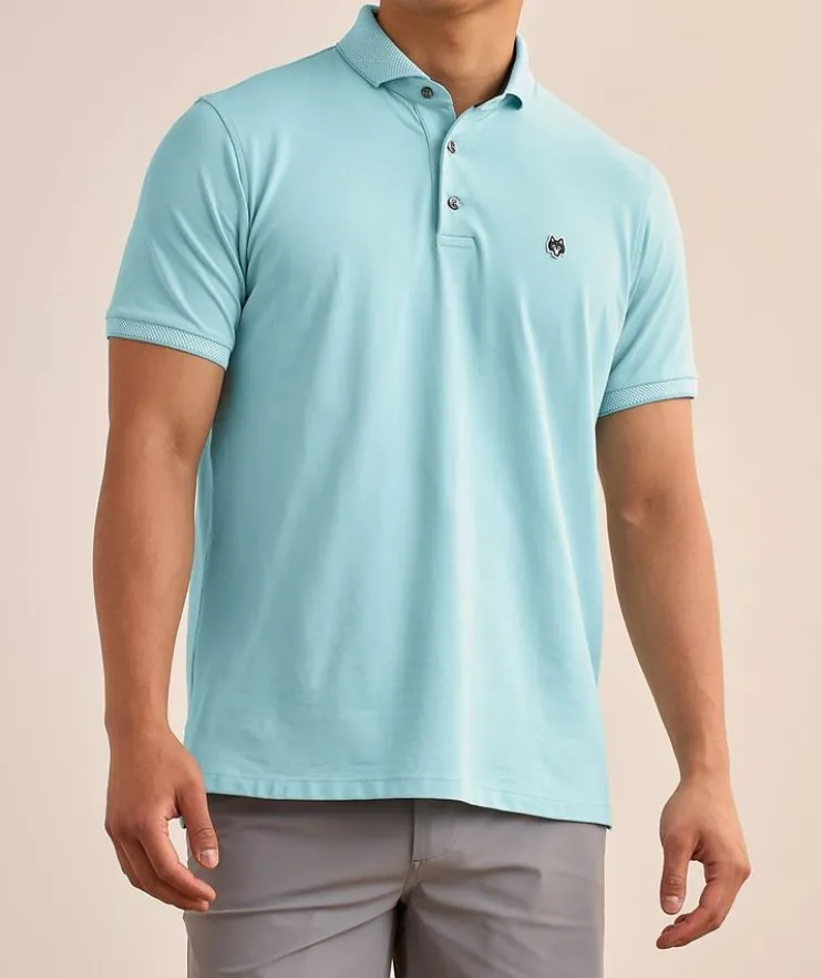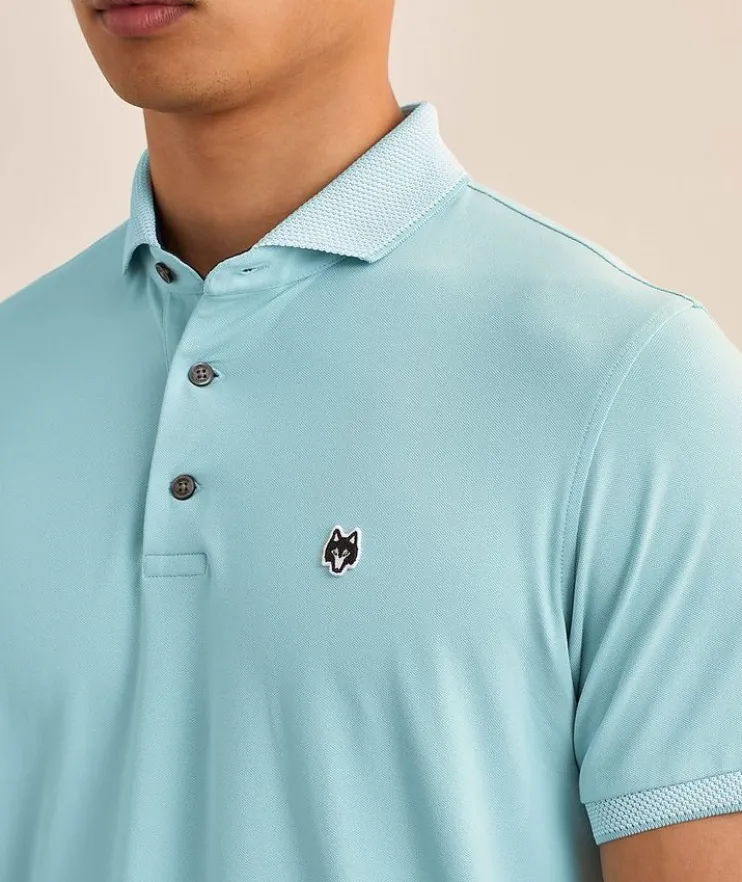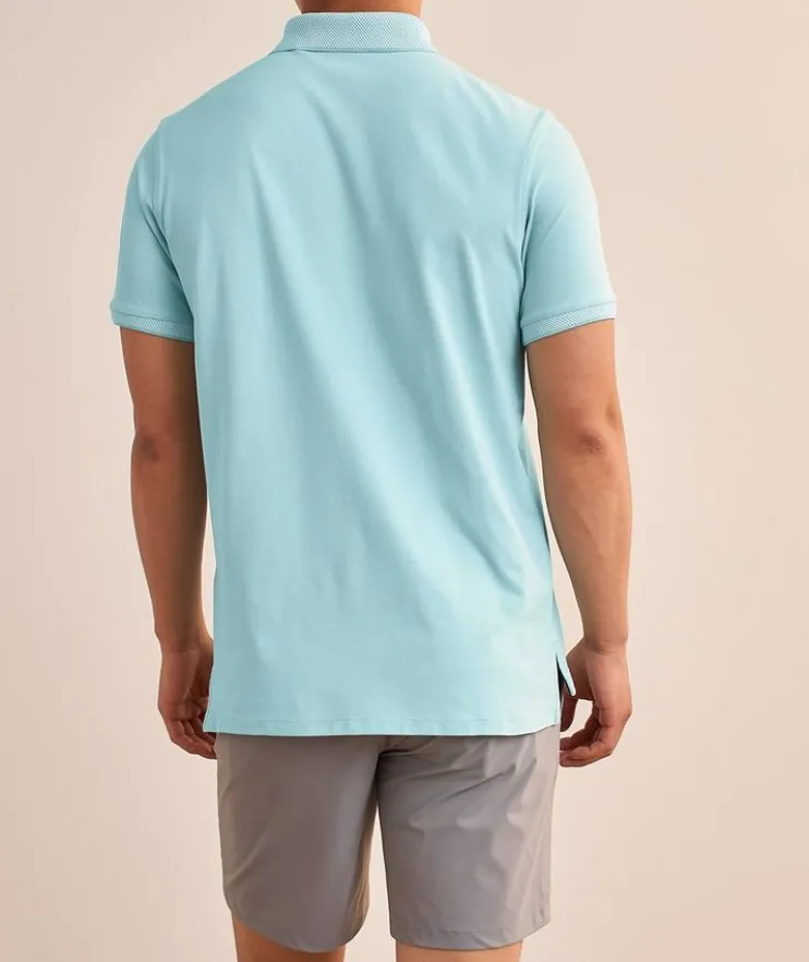 - This sporty polo is crafted from a breathable blend of Pima cotton with plenty of stretch for comfort and mobility on and off the golf course. Elevated with contrasting knit collar and cuffs for a contemporary look and finished with an embroidered logo detail.