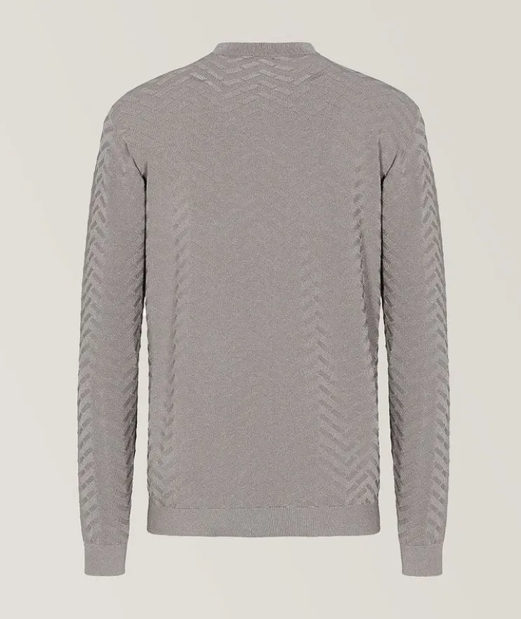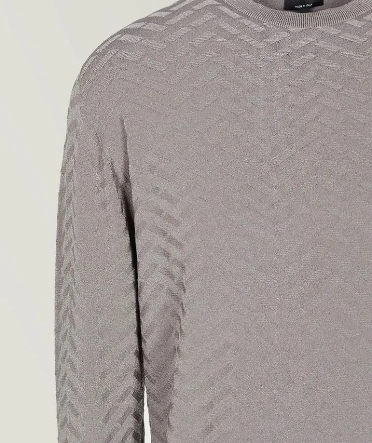 - Turn heads with this pullover sweater by Giorgio Armani. This slim-fit, crewneck pullover, made from a viscose blend, is embellished with the brand’s hallmark chevron motif. Its monochromatic details add brightness to the garment, creating a 3D effect that gives it movement. A style that completes any urban daytime look.