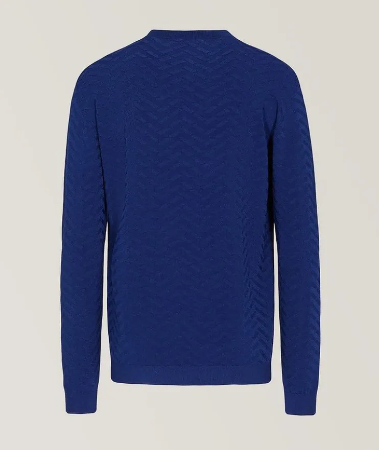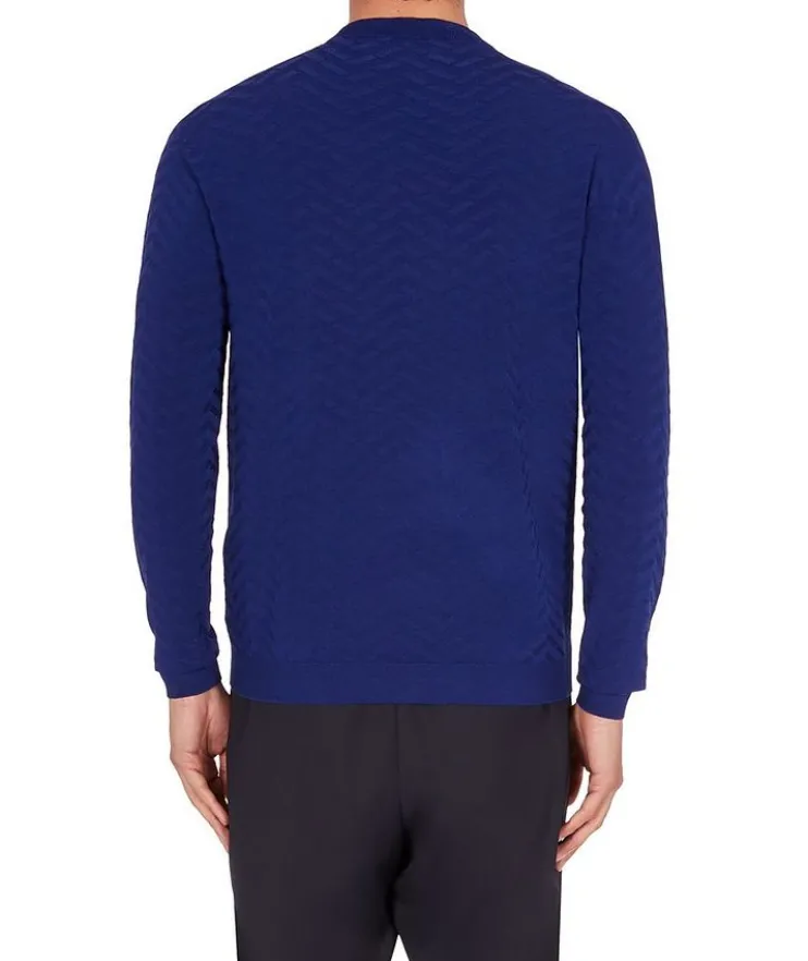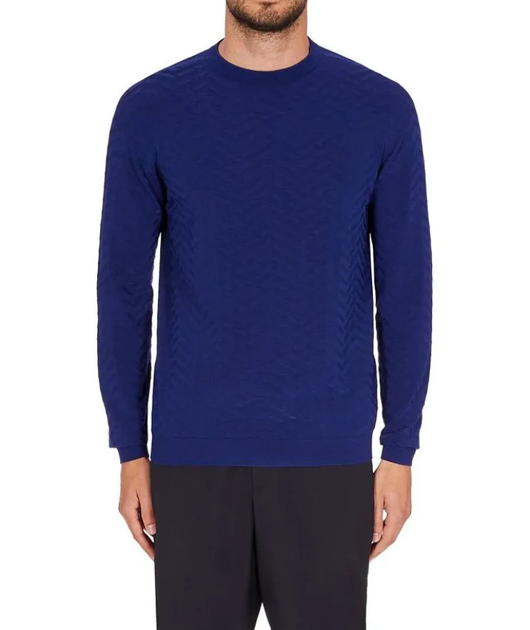 - Turn heads with this pullover sweater by Giorgio Armani. This slim-fit, crewneck pullover, made from a viscose blend, is embellished with the brand’s hallmark chevron motif. Its monochromatic details add brightness to the garment, creating a 3D effect that gives it movement. A style that completes any urban daytime look.