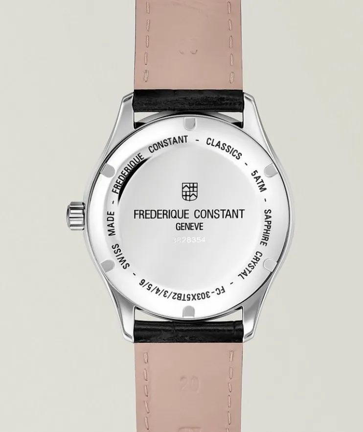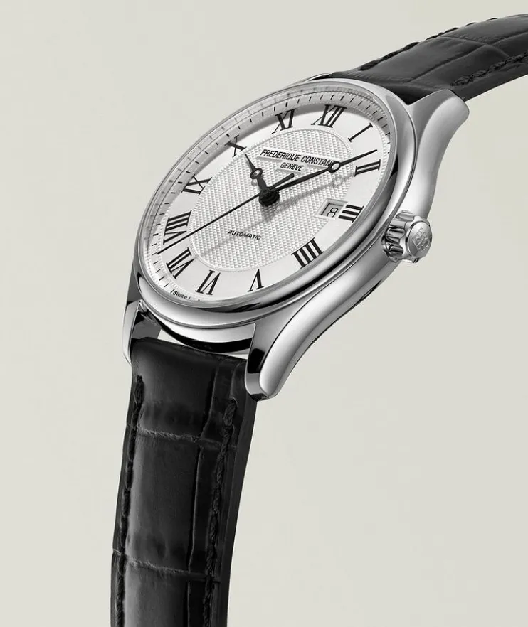 - From the Classics collection. Adorned with a refined dial and Roman numerals, this timepiece embodies exceptional craftsmanship with a stainless steel case and croc-embossed leather strap. Powered by an automatic movement, this ready-to-wear design boasts guilloché finishing for a timeless aesthetic. All Frederique Constant watches will come with security band. If band is removed or visibly damaged, product cannot be returned. Band must be in place and not tampered with.