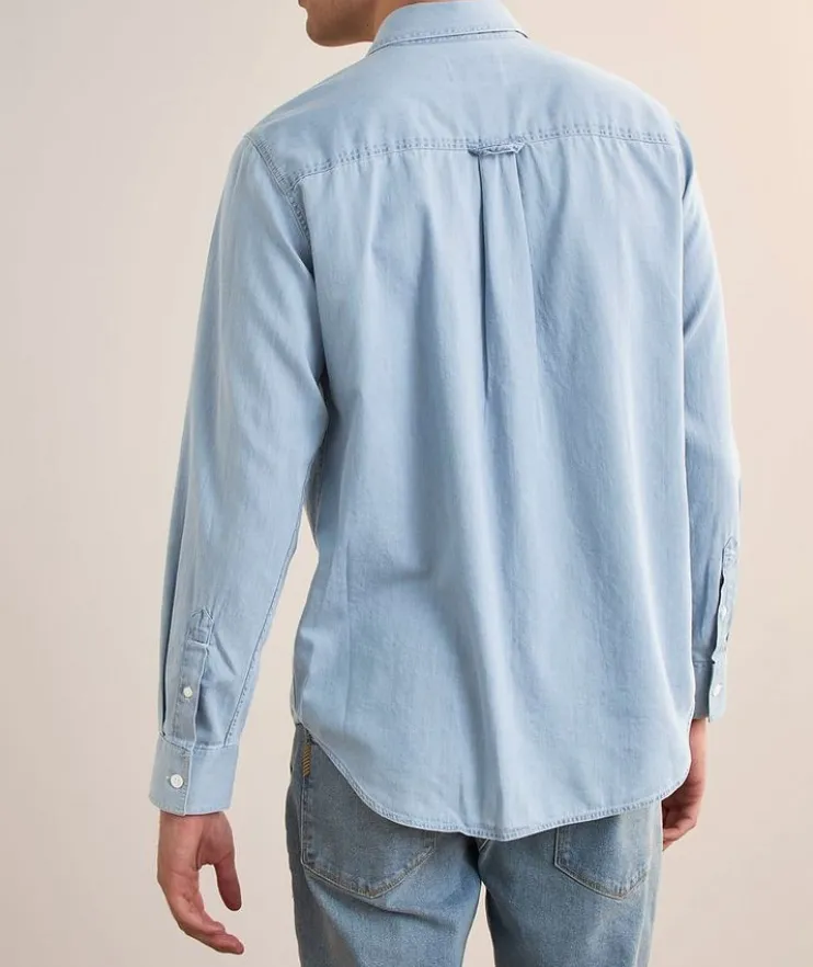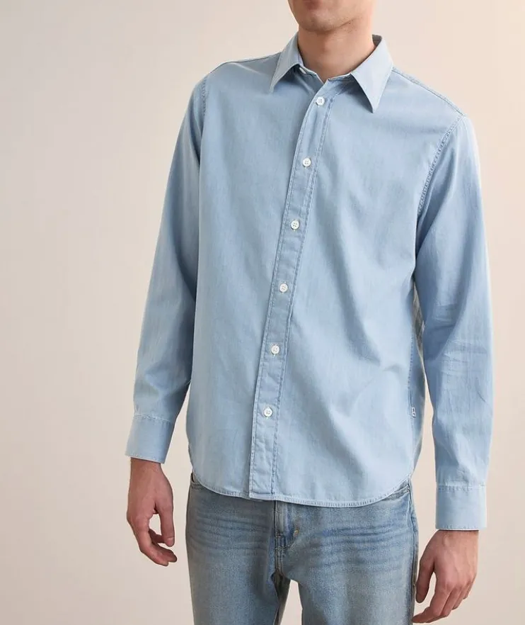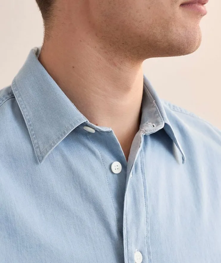 - Casual denim shirt crafted from soft Egyptian organic cotton twill features Mother-of-pearl buttons with a wide placket and large collar.