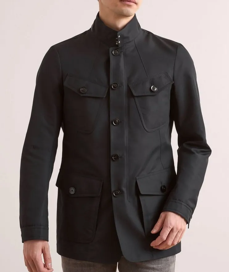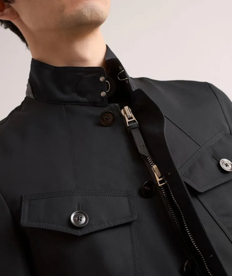 - Concealed zipper closure with buttoned storm placket