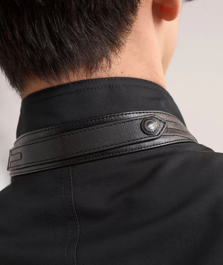 - Strap detail behind collar with snap-button closure