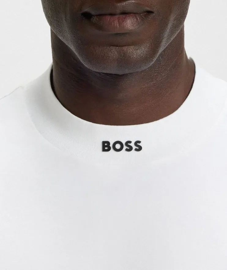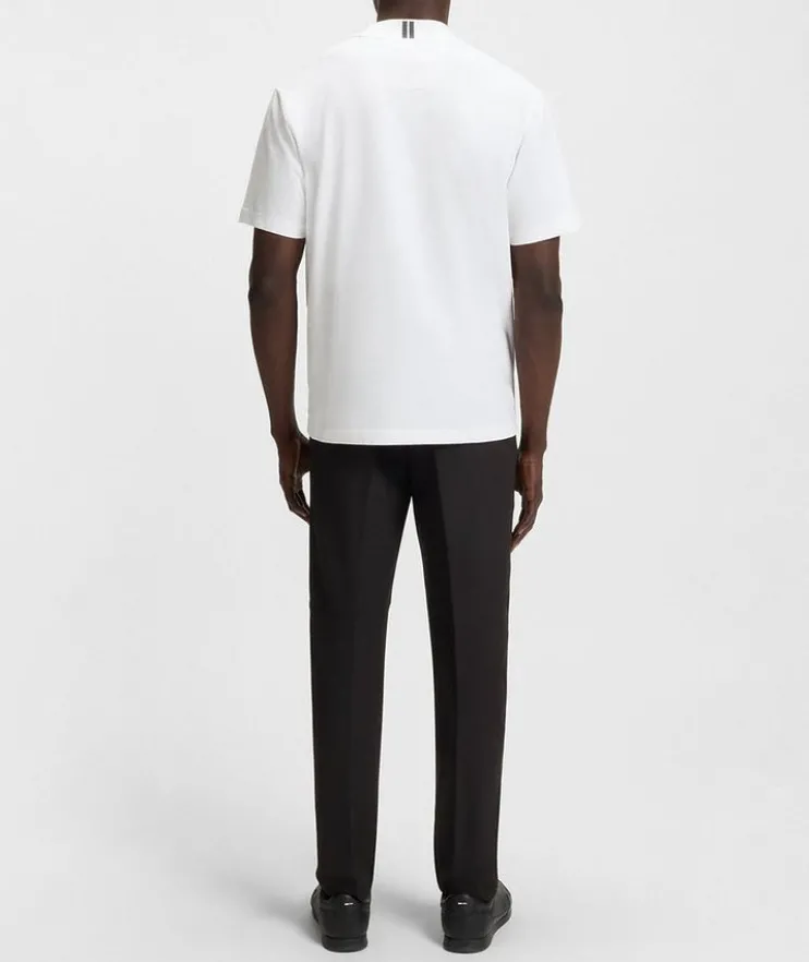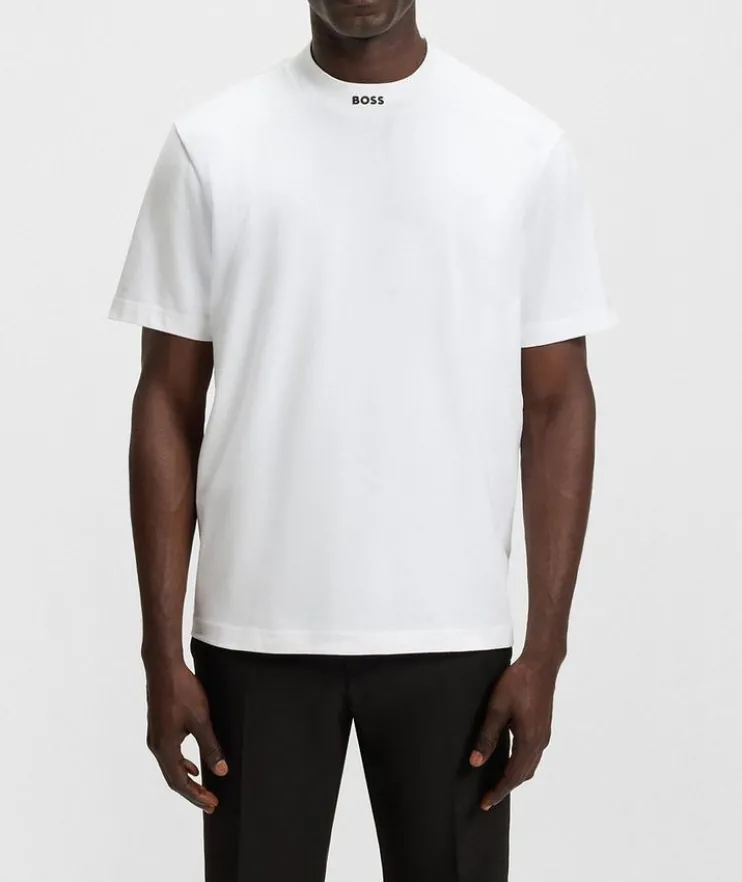 - Add impact to basic or layered looks with this relaxed-fit T-shirt, showcasing a contrast logo at the collar. Crafted from a breathable stretch-cotton jersey fabric for lasting comfort.