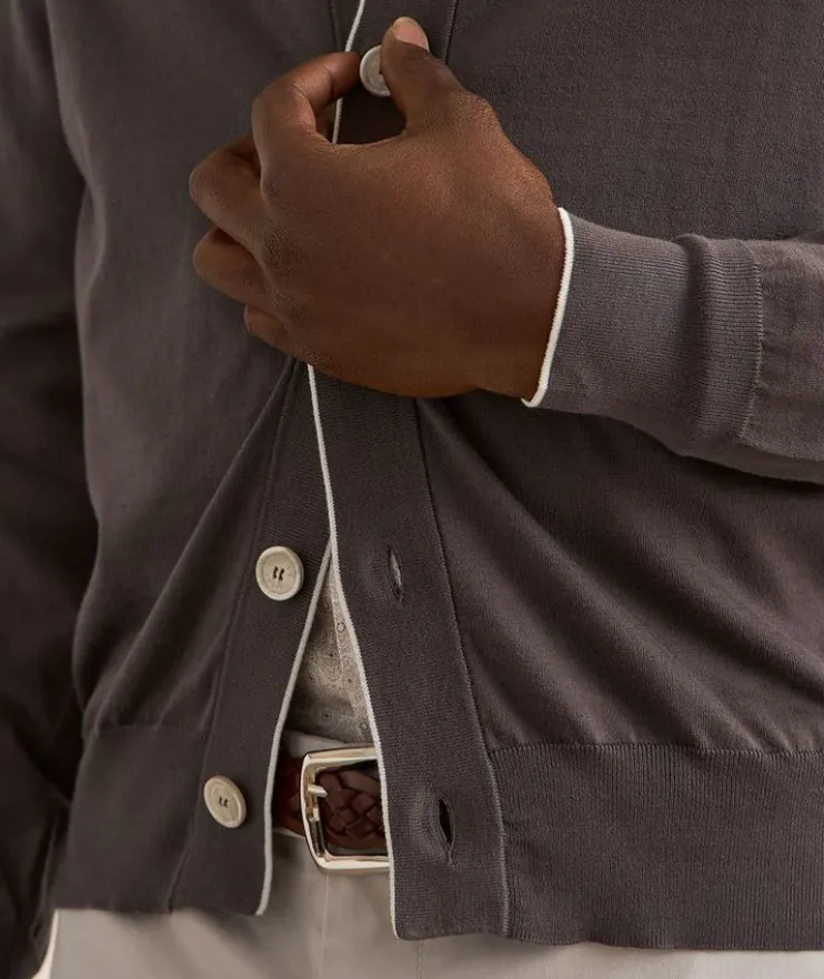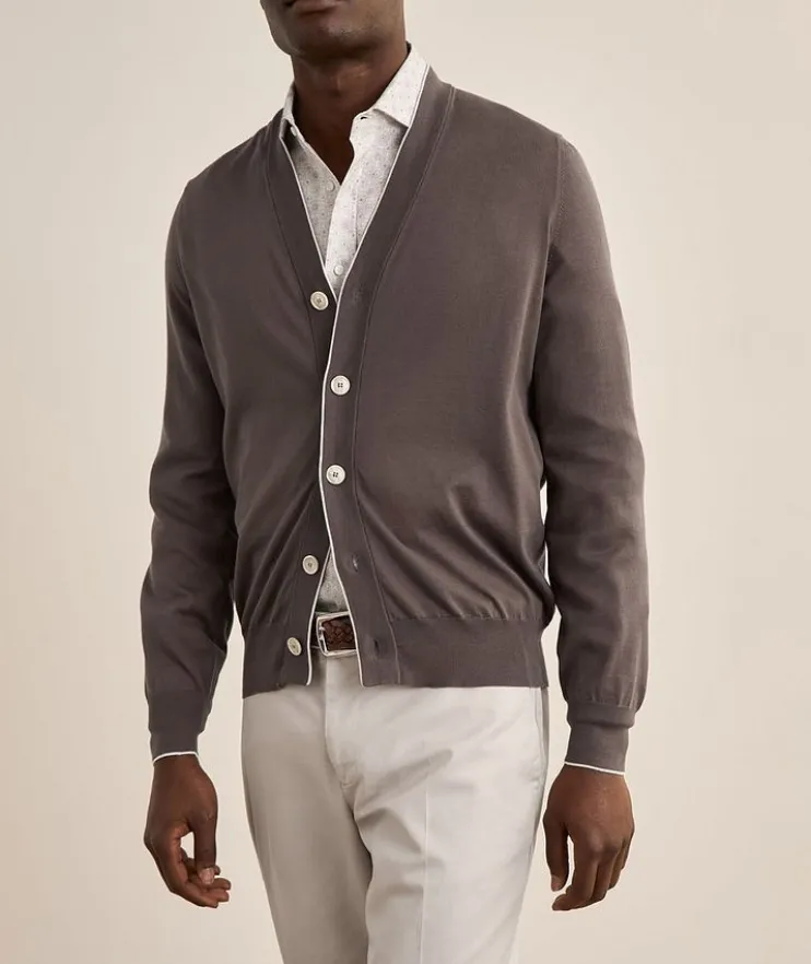 - Fashioned in refined, natural yarns for a casual feel, this pure cotton cardigan evokes timeless appeal and sophisticated branding with its lightweight texture and contrast tipping.