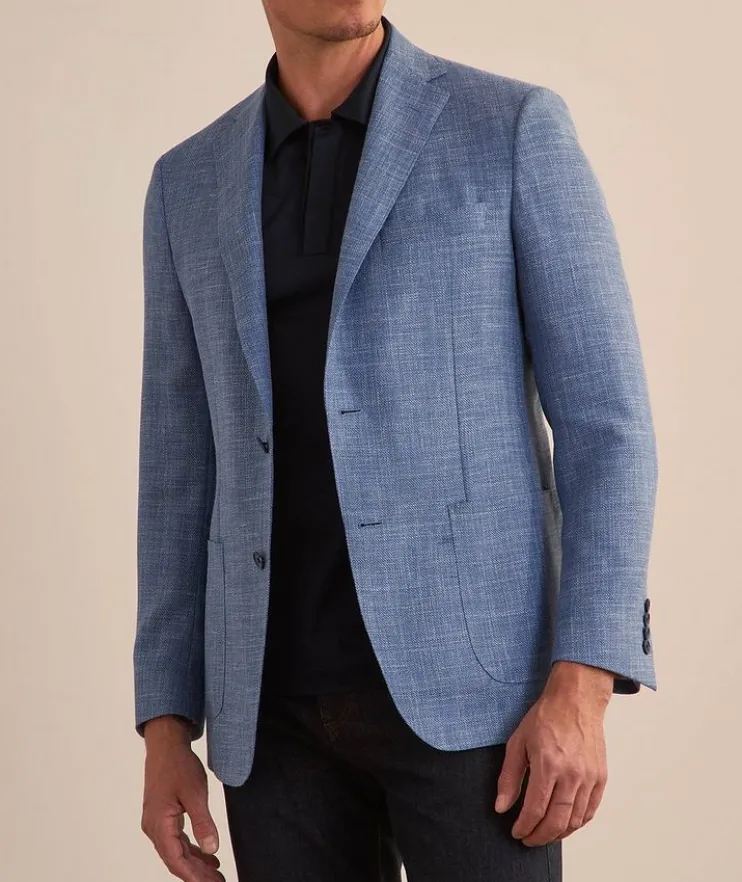 - This soft structured sport jacket is crafted from a premium blend of wool, silk and linen, and is finished in a textured solid design for stylish versatility.
