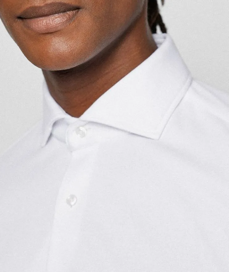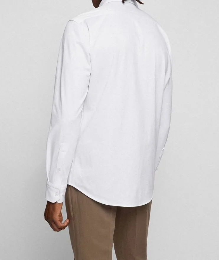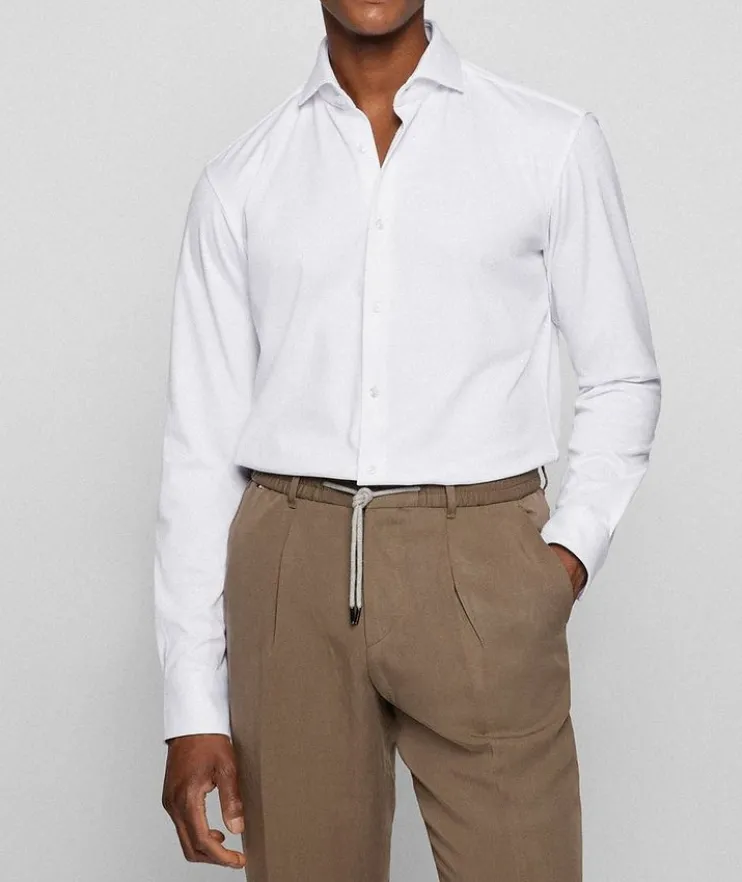 - Make an entrance like a boss in this dapper dress shirt from BOSS. Crafted with a structured cotton blend with super-flex properties for total comfort in movement, and cut in a regular fit for an easy silhouette, this dress shirt’s inner collar is detailed with piping for an attentive finish. The sleek shirt can be worn for contemporary workwear or evening looks alike.