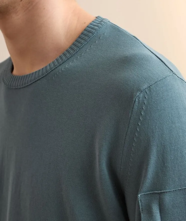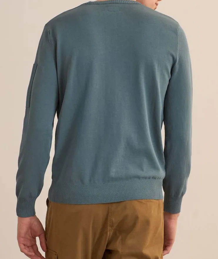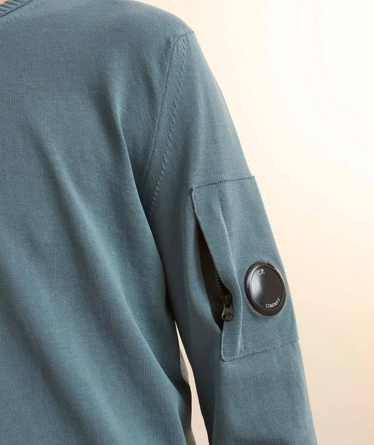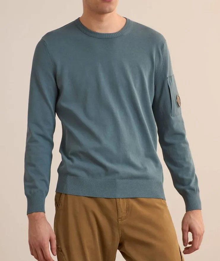- This classic crewneck sweater is crafted from old dyed cotton crepe and finished with a pocket and the brand’s lens logo detail at the sleeve for a modern appeal.