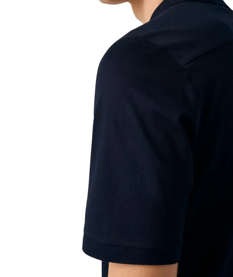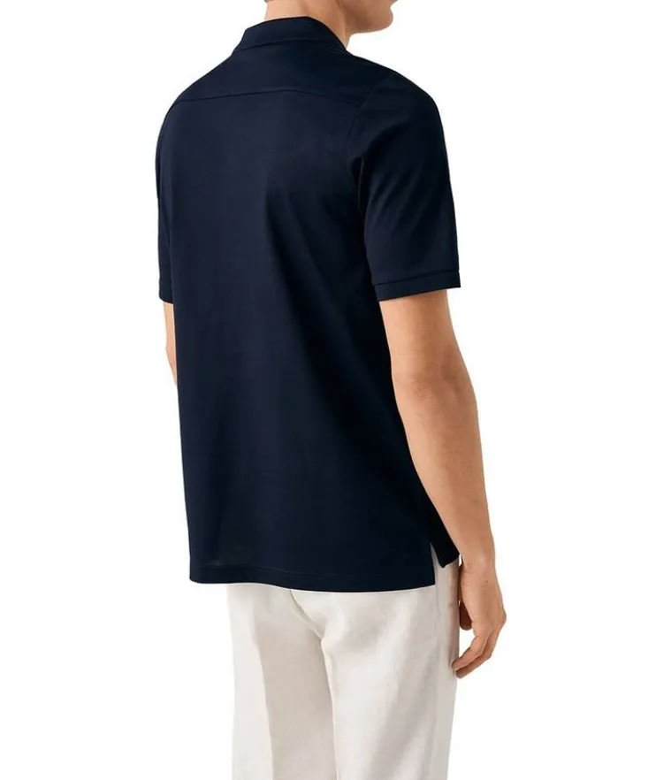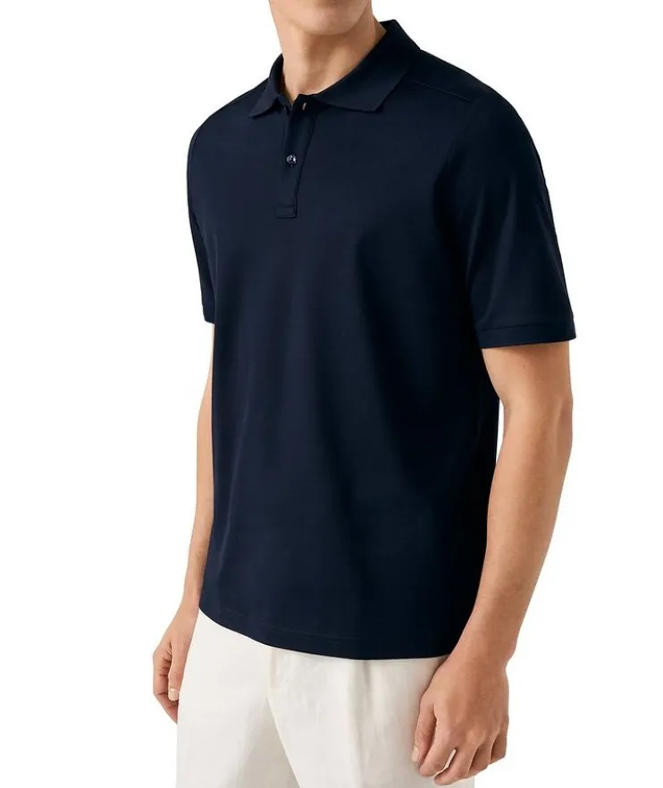 - A beautiful polo shirt cut from a solid piqué jersey fabric, knitted from Filo di Scozia yarn in Lombardy, Italy. Designed to offer you extra softness and flexibility, this polo shirt features a knitted collar and cuff, combined with a classic button fastening to create an effortlessly stylish look.
