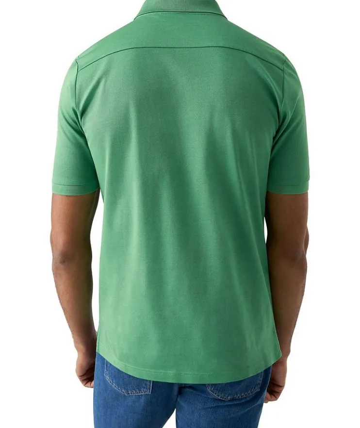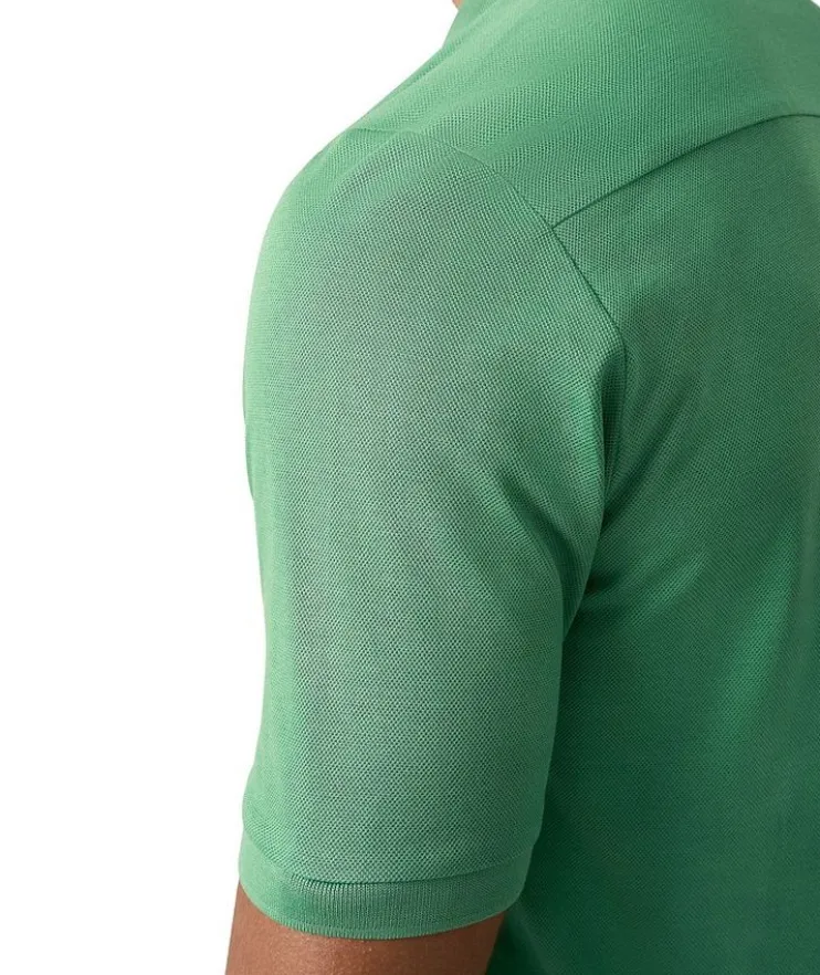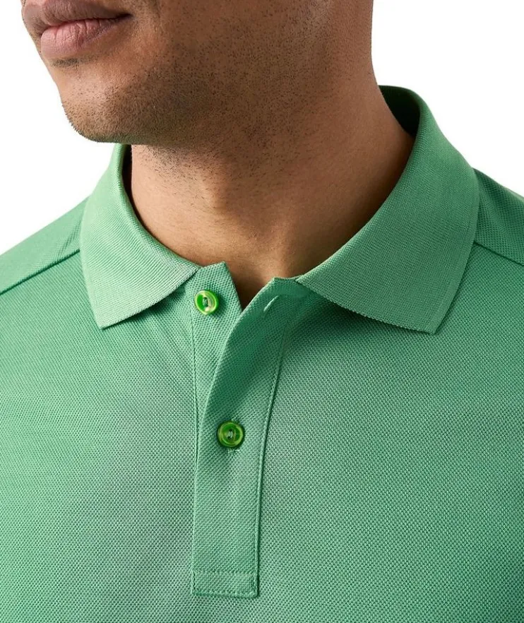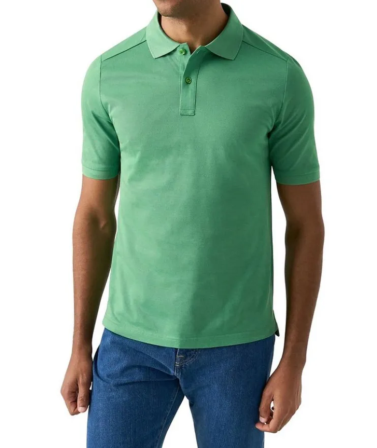 - A beautiful polo shirt cut from a solid piqué jersey fabric, knitted from Filo di Scozia yarn in Lombardy, Italy. Designed to offer you extra softness and flexibility, this polo shirt features a knitted collar and cuff, combined with a classic button fastening to create an effortlessly stylish look.
