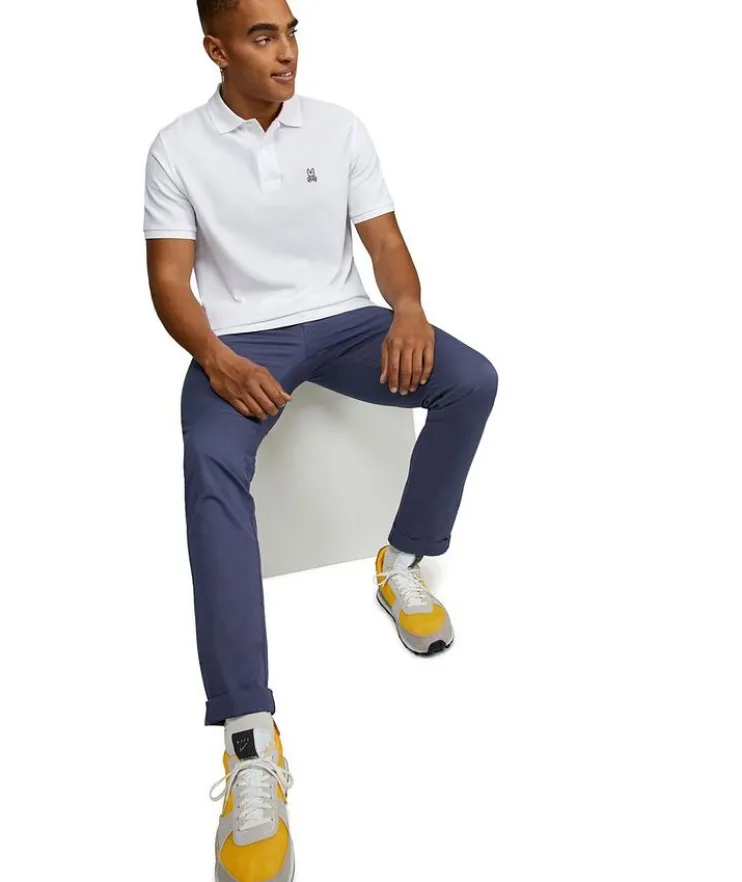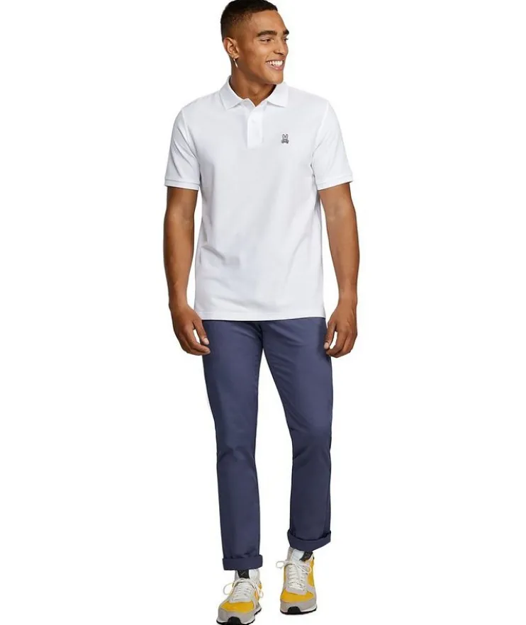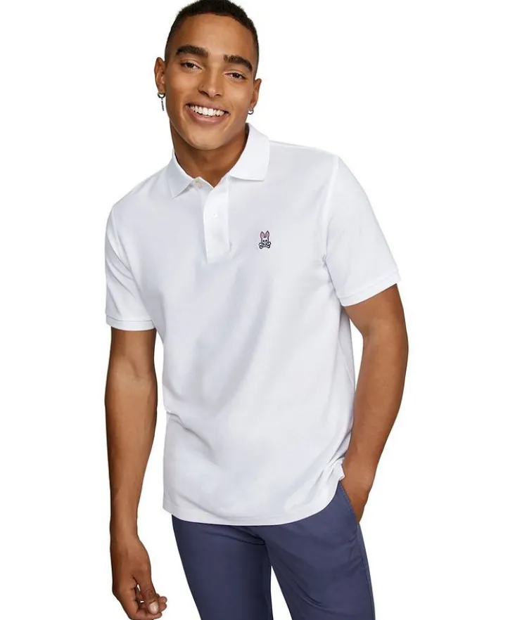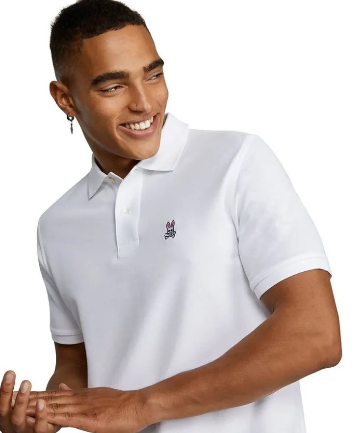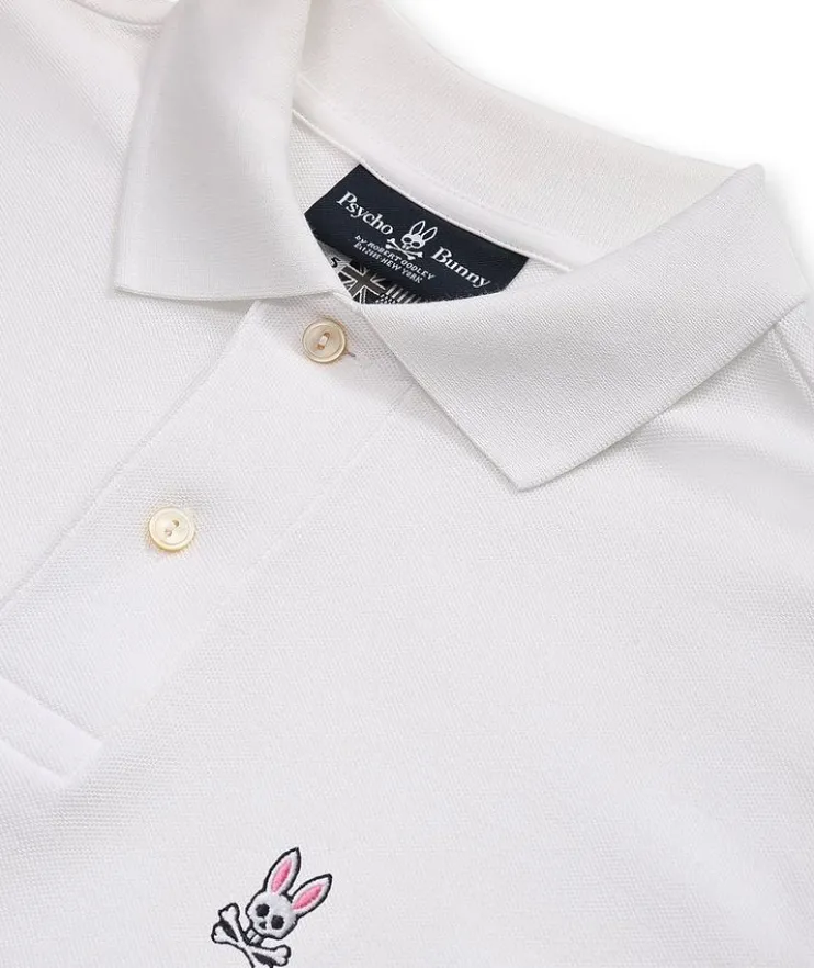 - Psycho Bunny has created the perfect polo; its collar is crease-resistant and doesn’t roll, it features taped seam construction, and its side vents ensure easy movement. Crafted using Peru’s finest Pima cotton with a diamond piqué knit, the classic design features a soft feel and a smooth finish. Mother-of-pearl buttons lend an extra touch of casual sophistication. On the left chest, the brand’s standout logo is embroidered using 4,000 stitches.