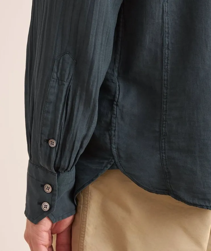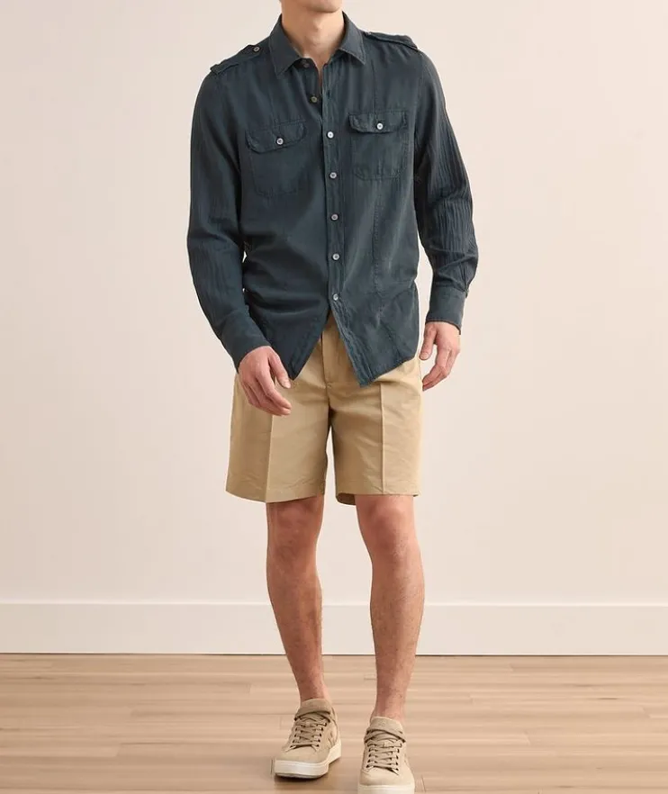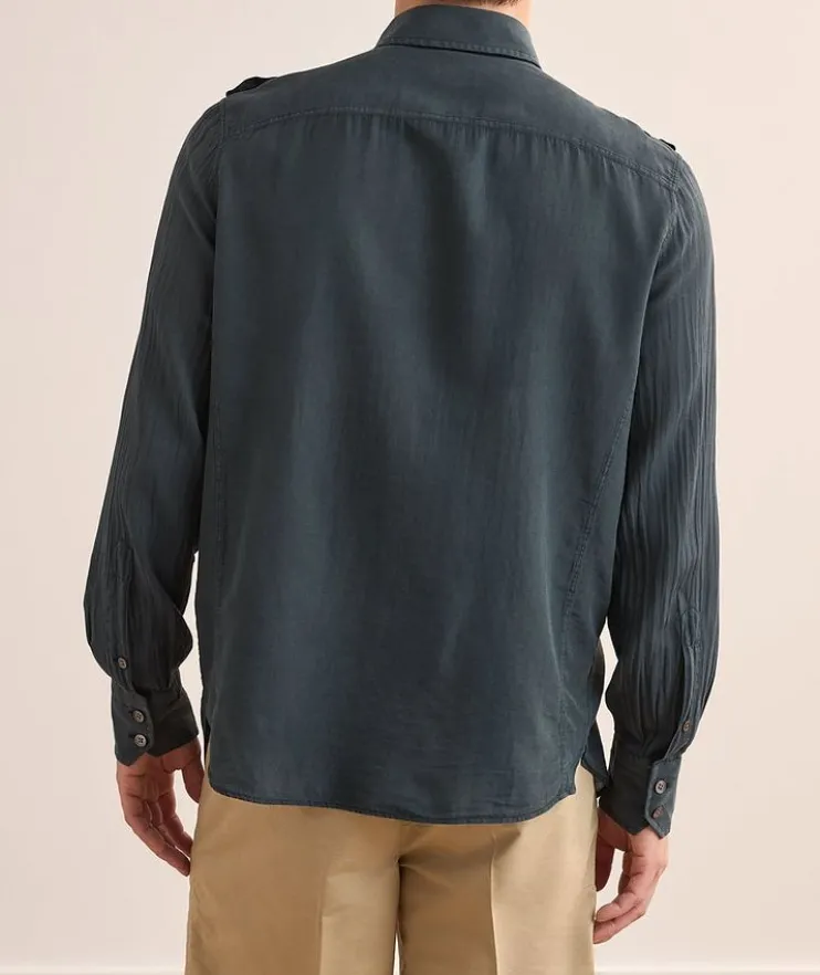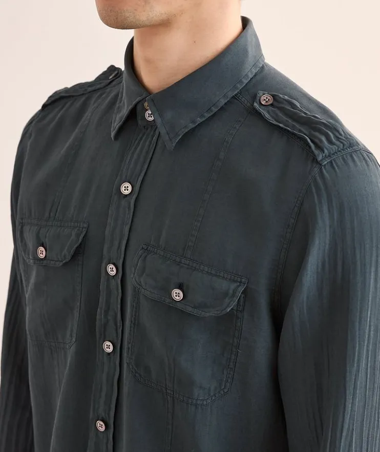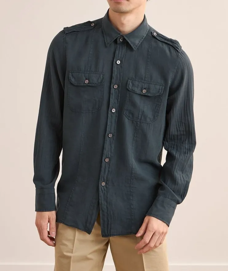- This lightweight shirt is cut from a blend of cotton and silk in a soft twill finish, with Mother-of-pearl buttons and pocket details for a utilitarian look.
