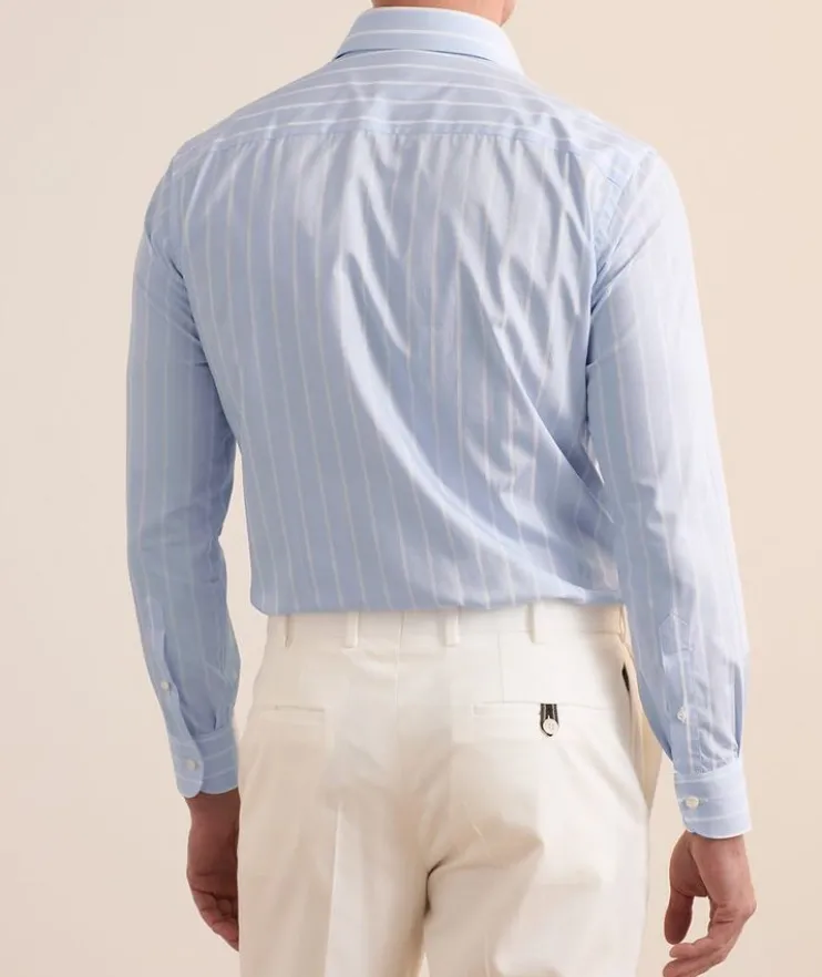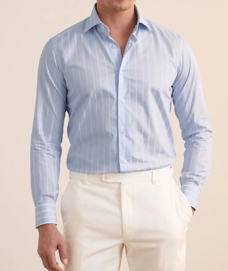 - Crafted from breathable cotton, this handsome dress shirt is constructed in a slim silhouette with a striped finish.