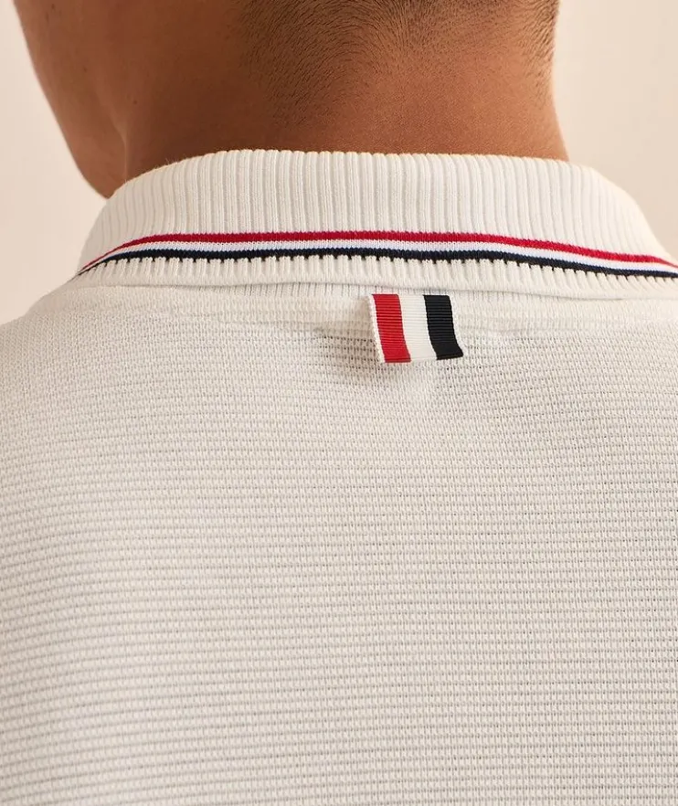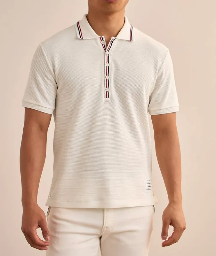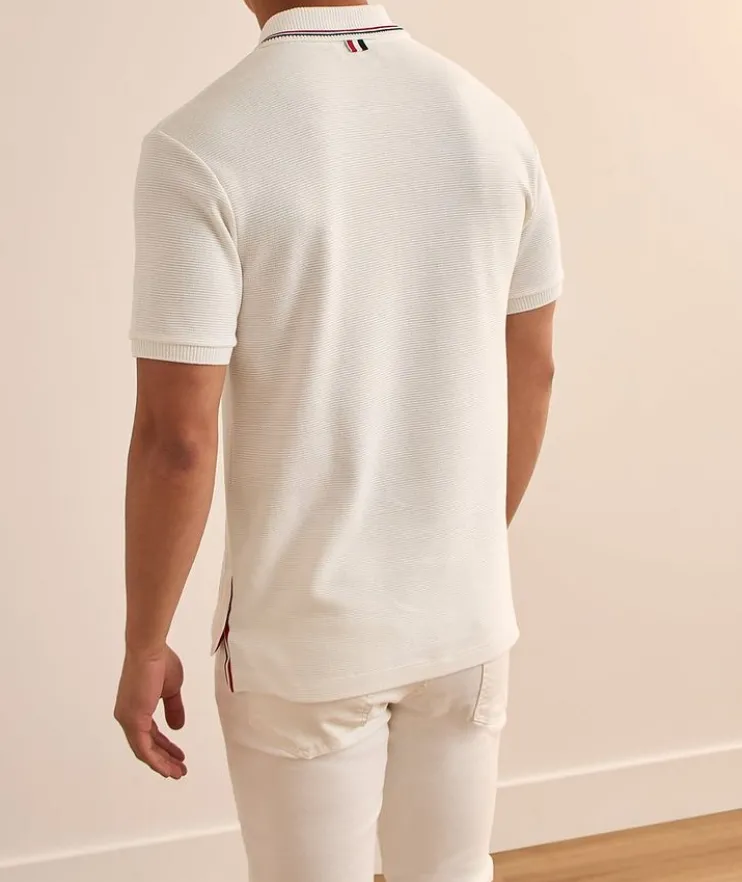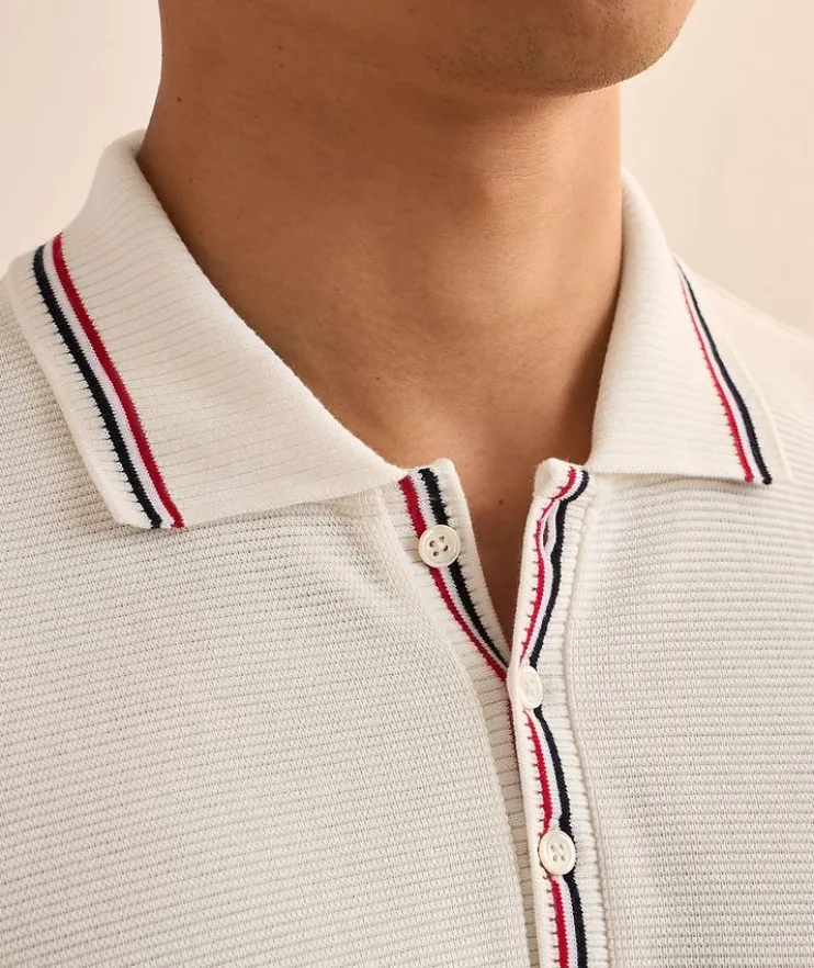 - This classic polo is crafted from breathable cotton in an on-trend waffle-knit finish for visual texture and is finished with ribbed and striped tipping details for a subtle sporty look. A versatile piece that can easily dress up or down for a variety of occasions, making it an elevated basic in any wardrobe.