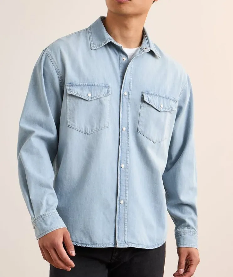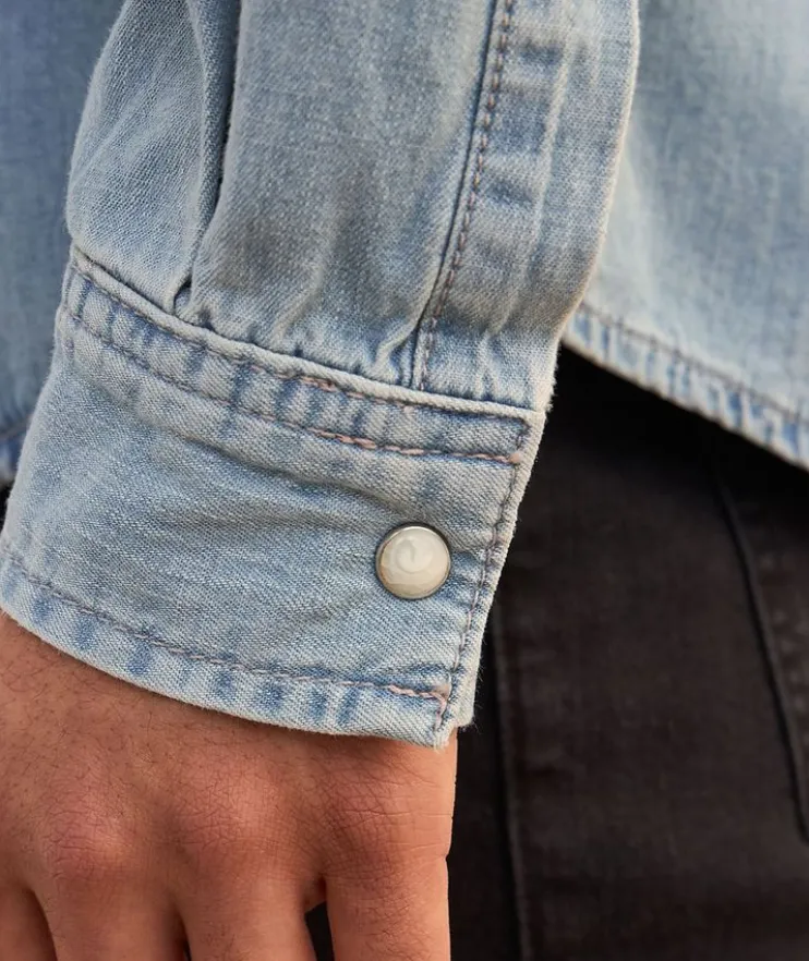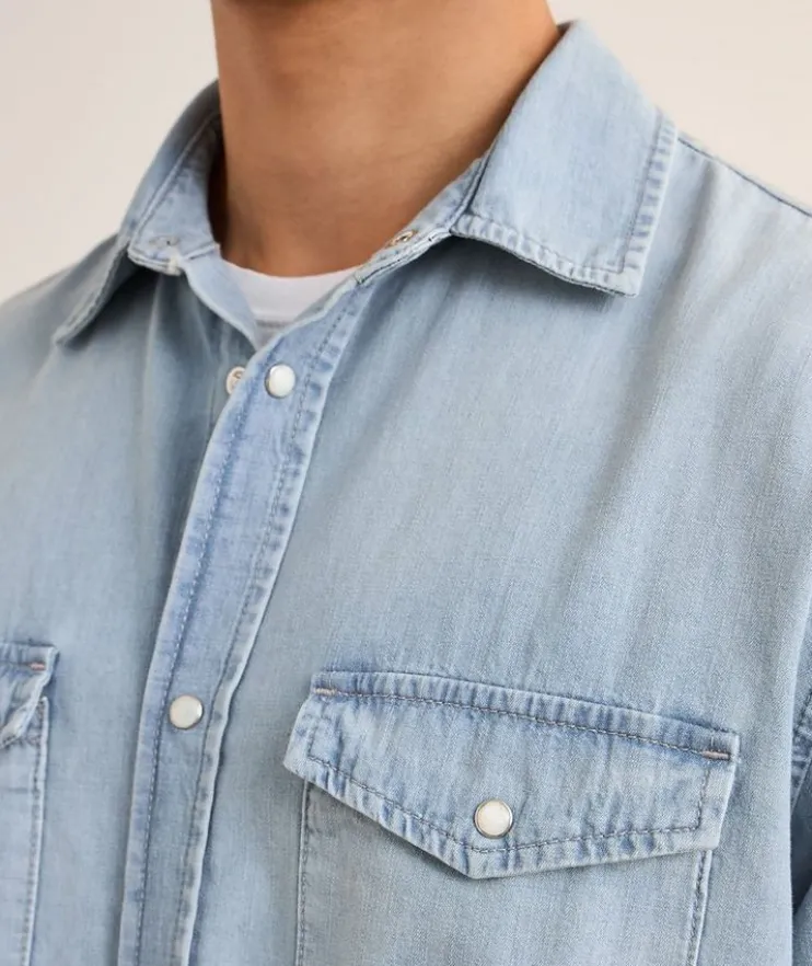 - Stitched without a front yoke for a streamlined approach, this updated Western shirt follows tradition with chest snap-flap pockets, snap-button cuffs and a gently curved hem. Finished in Japanese fabric, this all-cotton essential boasts a faded wash for a lived-in look and casual feel.