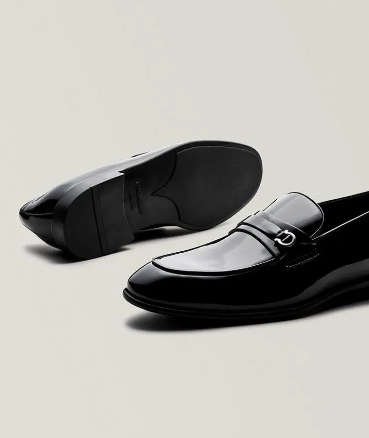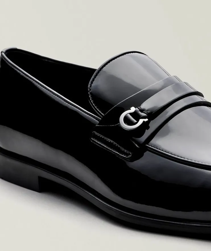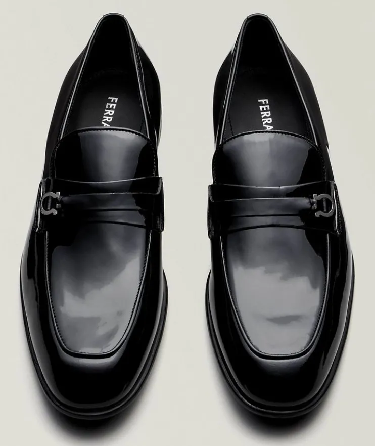 - Expertly crafted in Italy from shiny patent leather, these sleek loafers feature a timeless silhouette with the brand’s signature Gancini hardware detail on the vamp strap. This classic style easily elevates any formal ensemble. For a custom fit with your loafer, choose a full size down from your sneaker size to allow the snug leather to conform to your foot and gradually stretch to your size for a personalized fit over time.