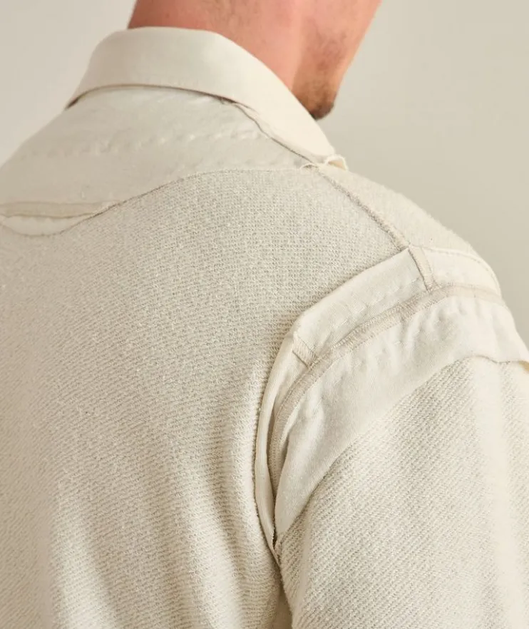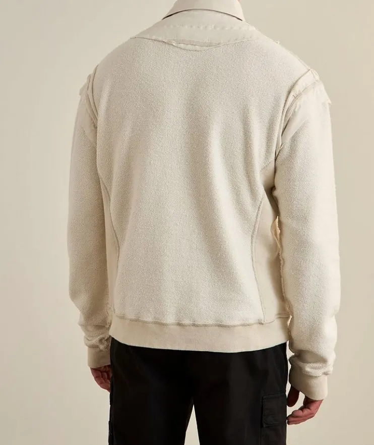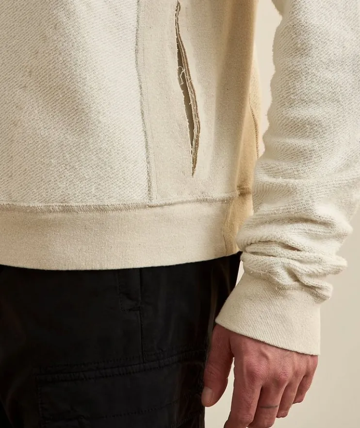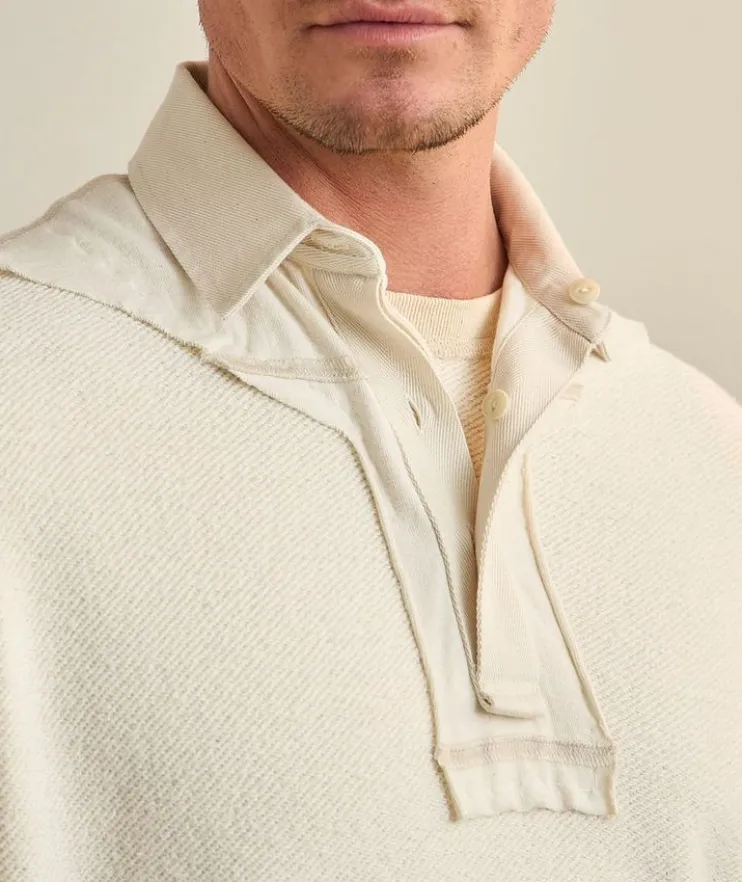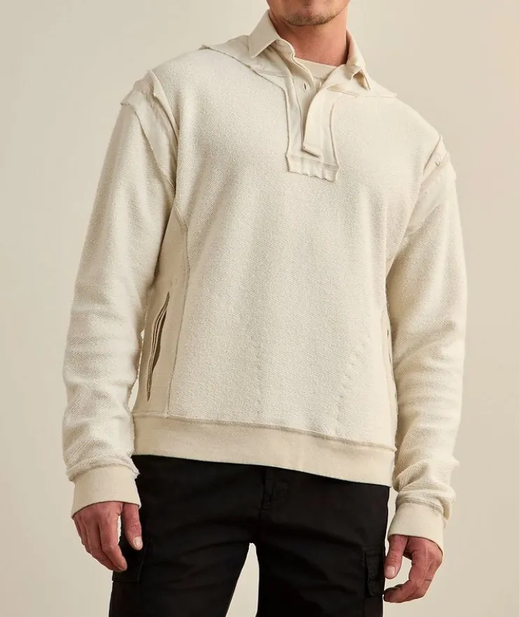 - Characterized by sections with an unfinished inside out aesthetic, this polo-style sweatshirt is finished with long sleeves and ribbed edges with the brand’s signature Four Stitches on the back.