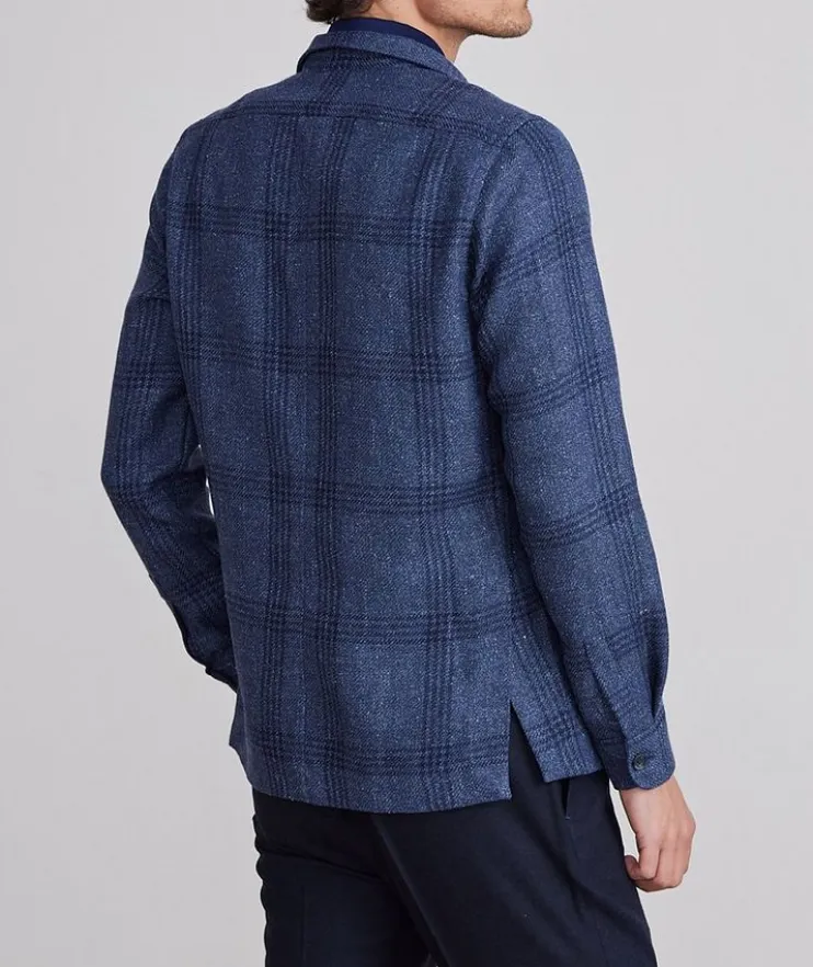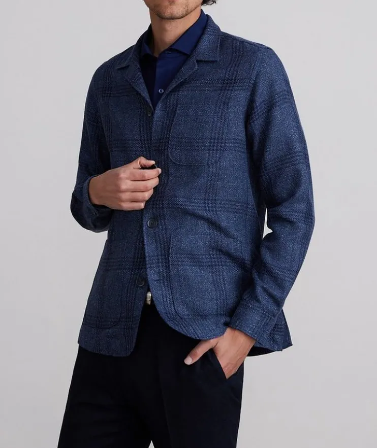 - Strike a perfect balance between tailored and casual with this functional shirt jacket. Expertly crafted from lightweight, breathable linen, silk, wool and cotton-blend, this warm weather topper features a button front closure and patch pockets with a classic dobby check finish.