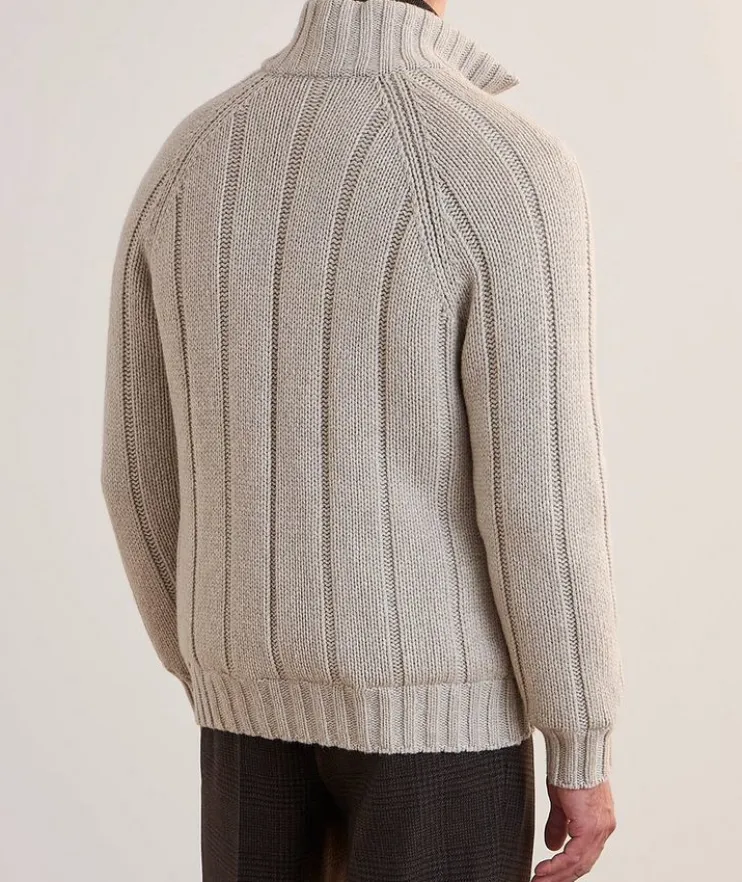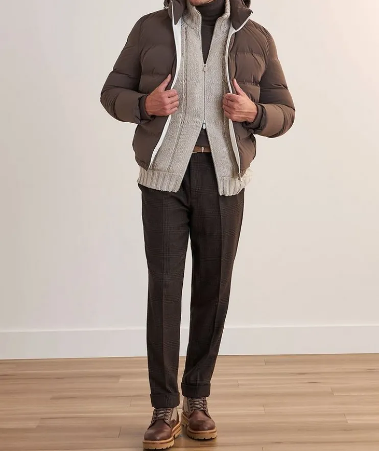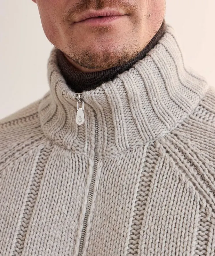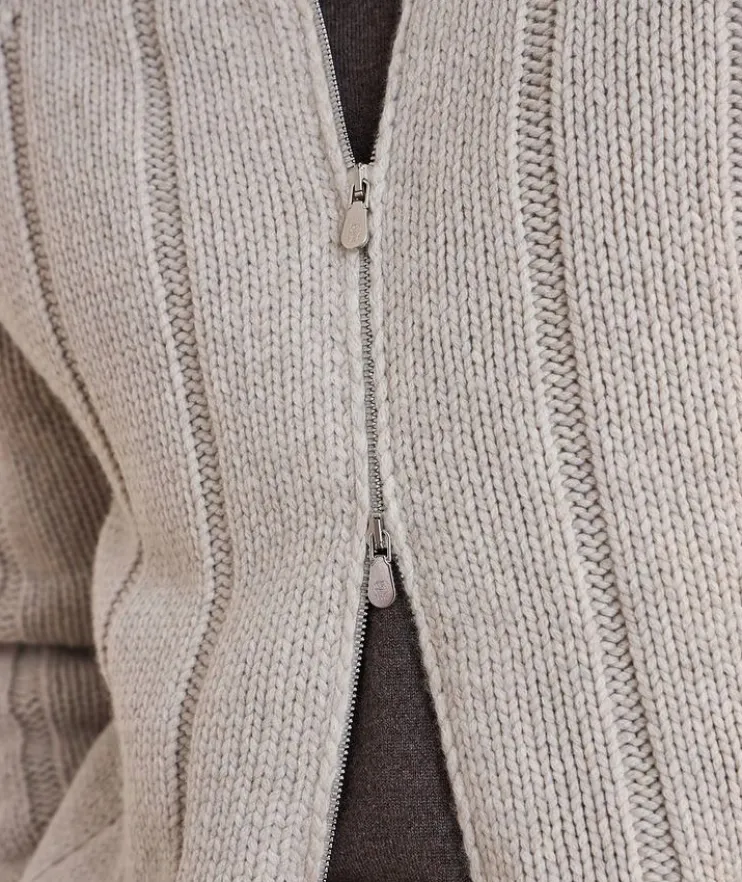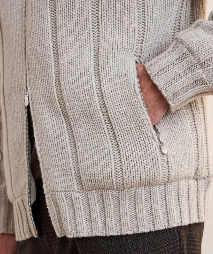 - Cut to a relaxed fit, this cozy sweater with a chunky knit finish is an elevated piece that exudes sophistication and comfort on every occasion. Rendered in pure cashmere, this zip-front topper is down-filled for added warmth and protection when transitioning through the seasons.
