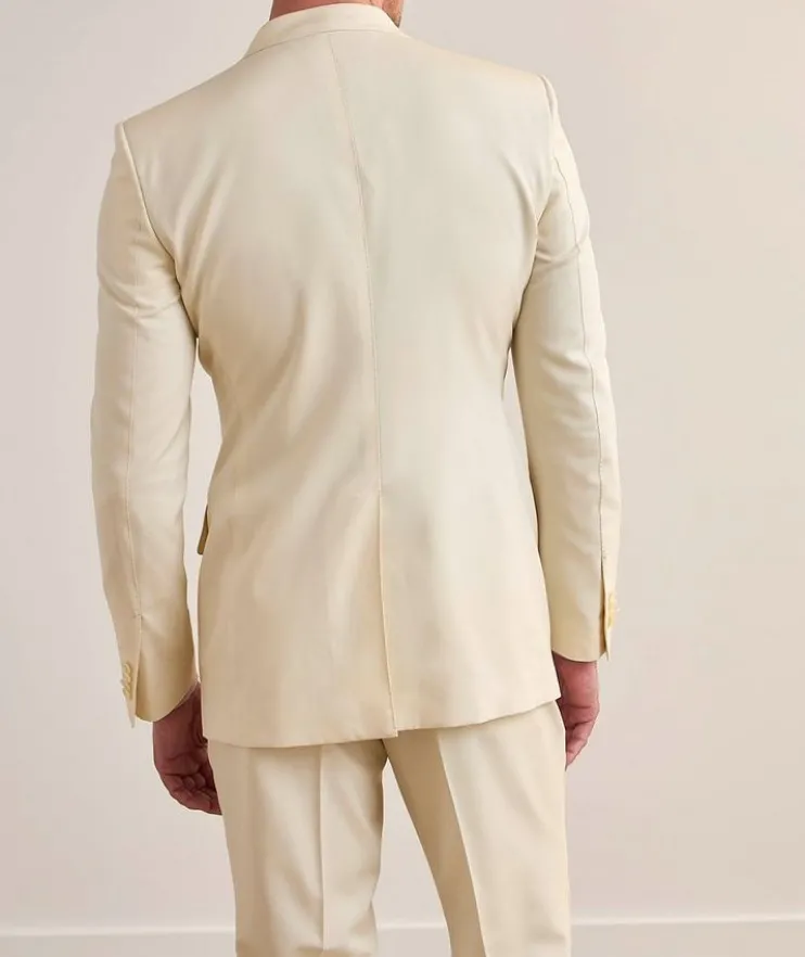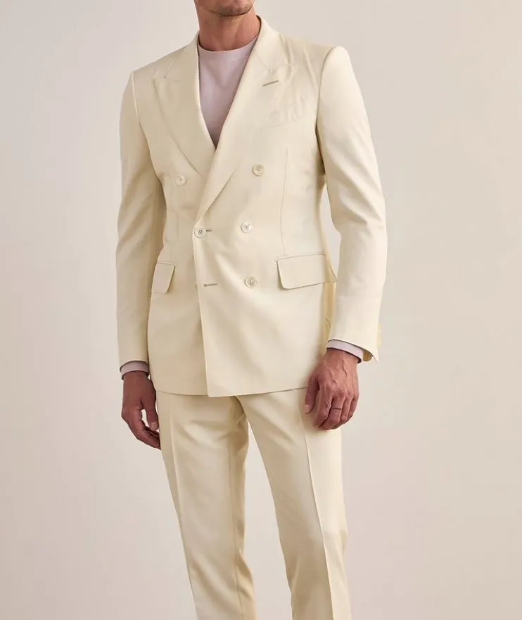 - An elegant choice for any formal affair, this double-breasted suit is crafted from a premium blend of silk and wool with Mother-of-pearl button details for a luxurious look. Finished in a plain weave for timeless styling. This garment is unfinished, alterations are required.
