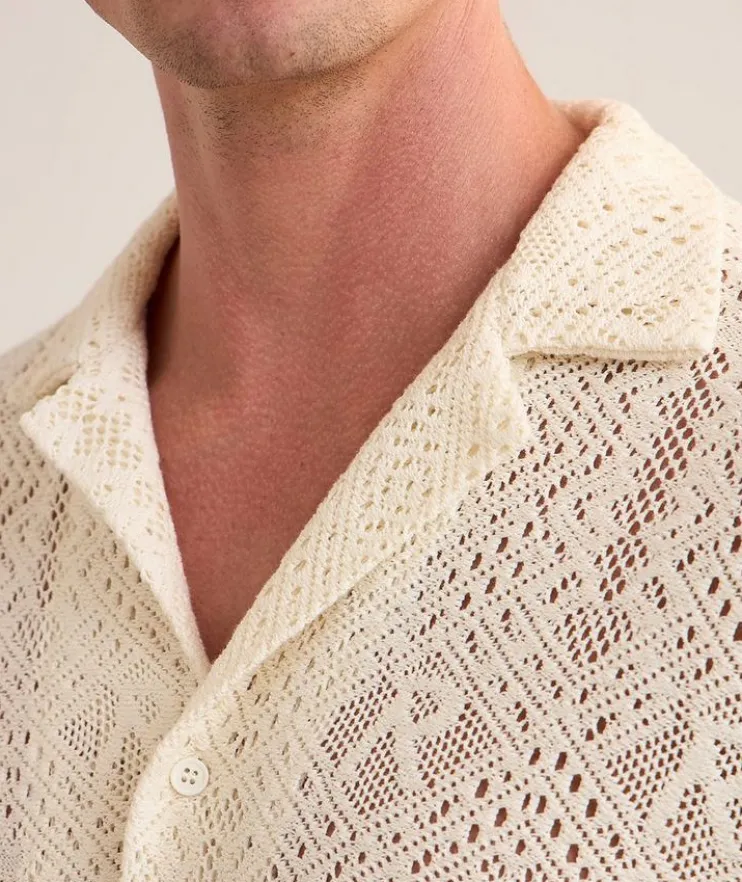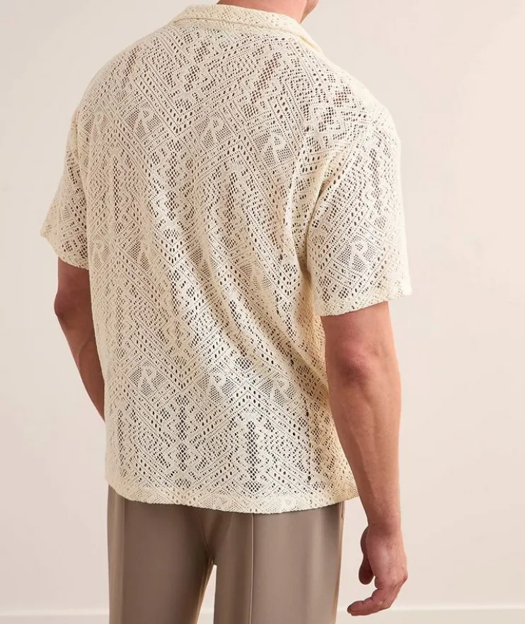 - A statement unlined piece that blends intricate craftsmanship with lightweight wearability, this airy open-knit crochet shirt features an allover ‘R’ monogram pattern woven directly into the fabric for quiet luxury and a signature finish.