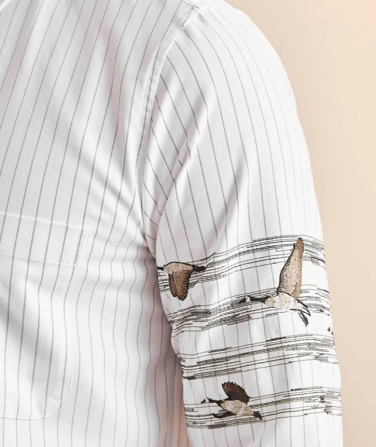 - This classic button-down shirt receives a playful update with embroidered geese and 4-bar stitching at the sleeve. Crafted from breathable cotton and finished with the brand’s name tag applique.