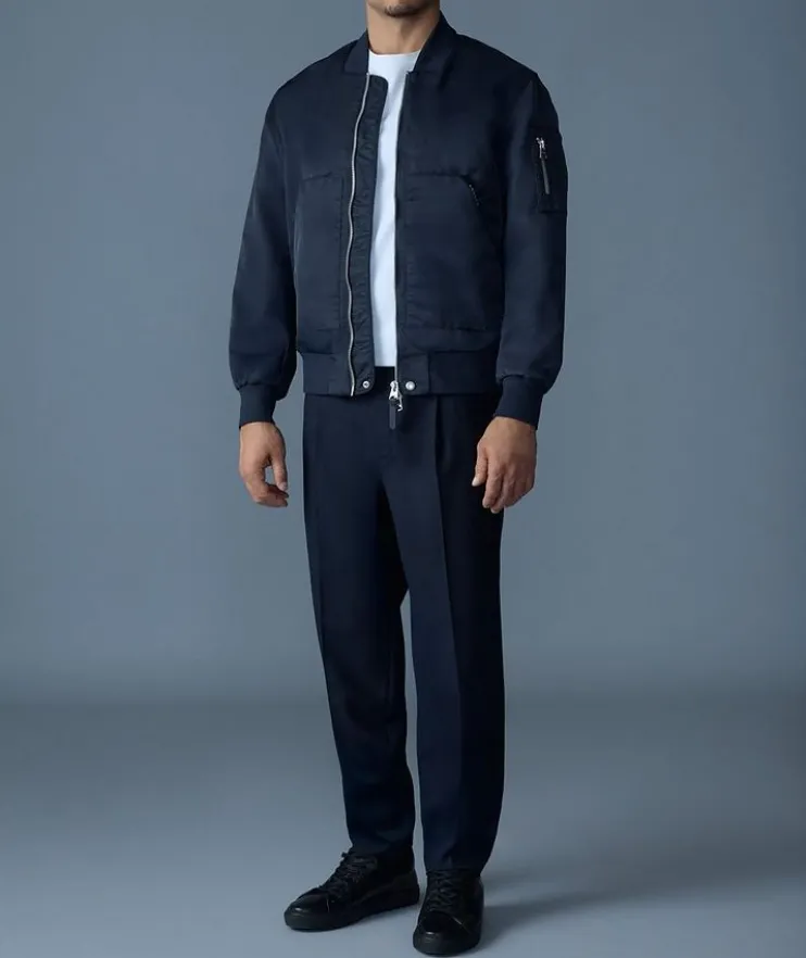 - A satin bomber jacket with a full fleece jersey interior for added comfort, this design features a square neckline bomber collar, rib knit details and functional patch pockets. Secondary zippered pocket closures and underarm eyelets for ventilation enhance its practicality.