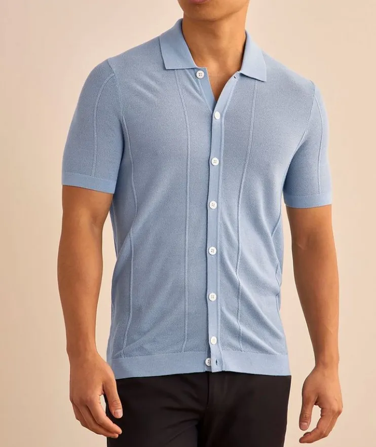 - Crafted from a luxurious combination of merino wool and silk, this polo offers softness and refined texture. The front button and stitching design add depth and sophistication, making it a versatile choice for both refined casual and smart dressing.