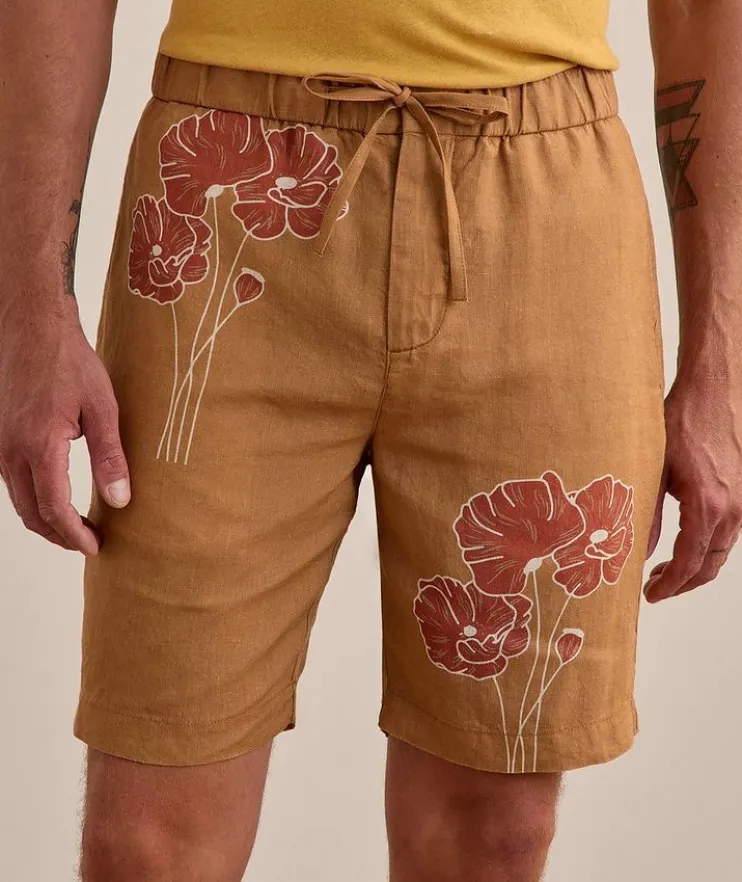 - With a relaxed silhouette and lightweight linen construction, these shorts are a versatile staple for any warm-weather wardrobe. Adorned with a seasonal Linear Floral print, inspired by Rio de Janeiro’s state flower the Begônia, this style is finished with an elasticized drawstring waist ensuring effortless movement and all-day ease.