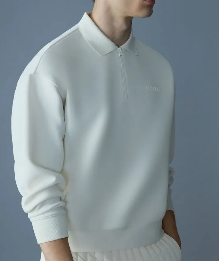 - A luxe update to a lounge essential, this double-face jersey half-zip sweater features a flat knit polo collar and rib knit cuffs and hem. A rubberized MACKAGE logo on the chest adds a subtle yet distinct brand touch.