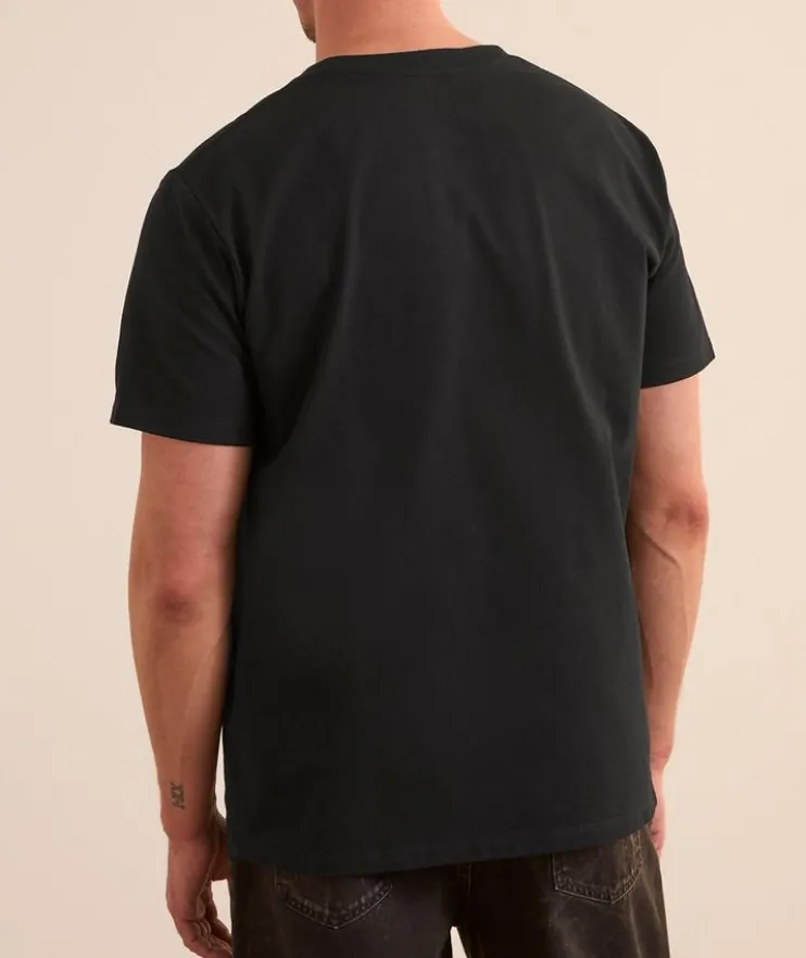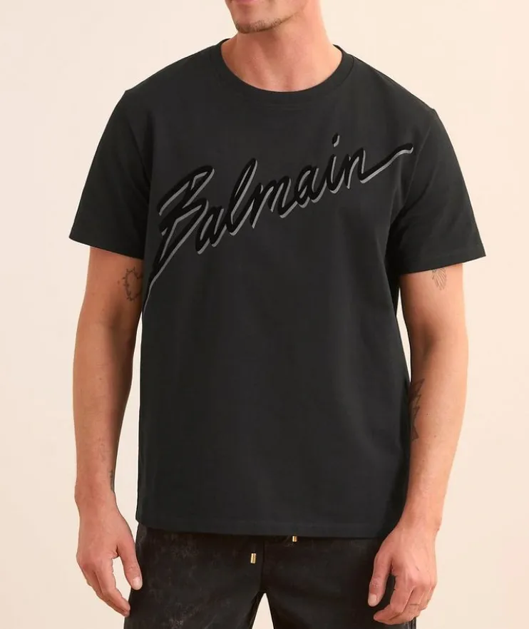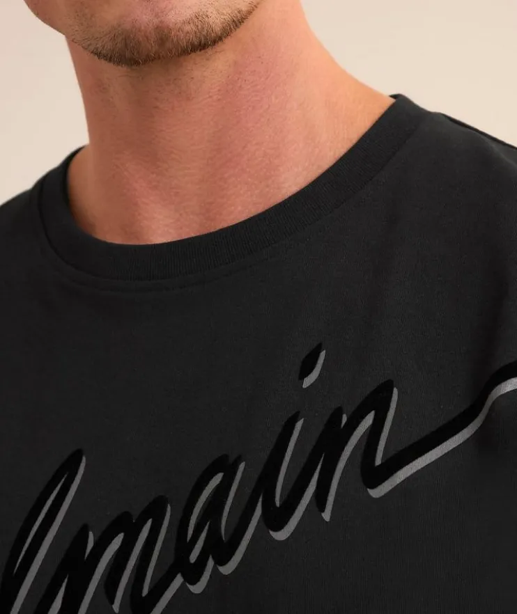 - This crewneck T-shirt is constructed from heavyweight cotton and features a cursive logo print with flocked velvet detailing for a laidback aesthetic.
