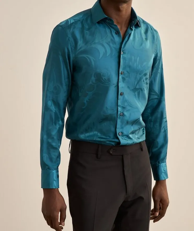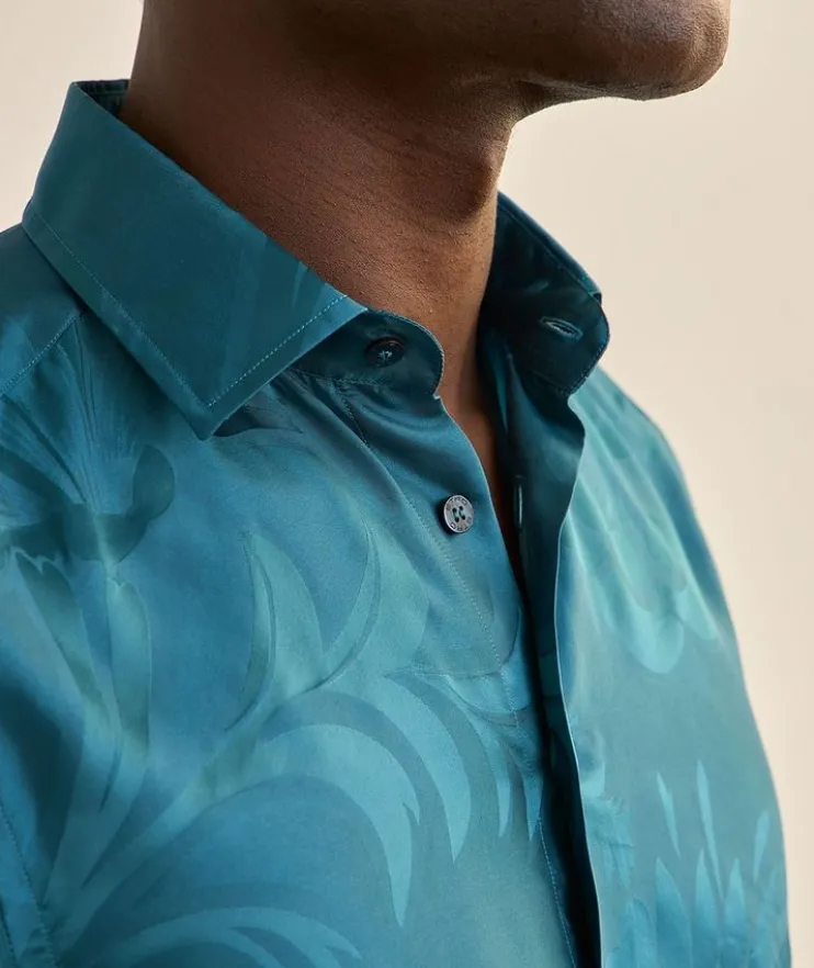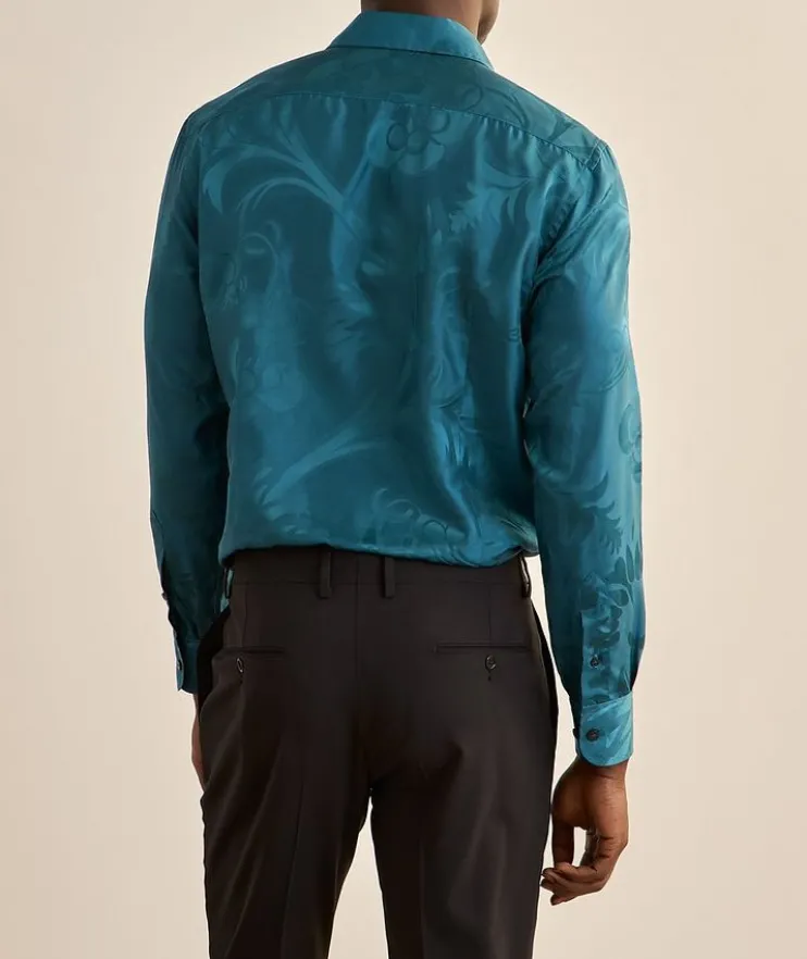 - Crafted from a shiny silk-blend, this collared shirt features a tone-on-tone floral motif and can easily be styled for both casual and formal occasions.