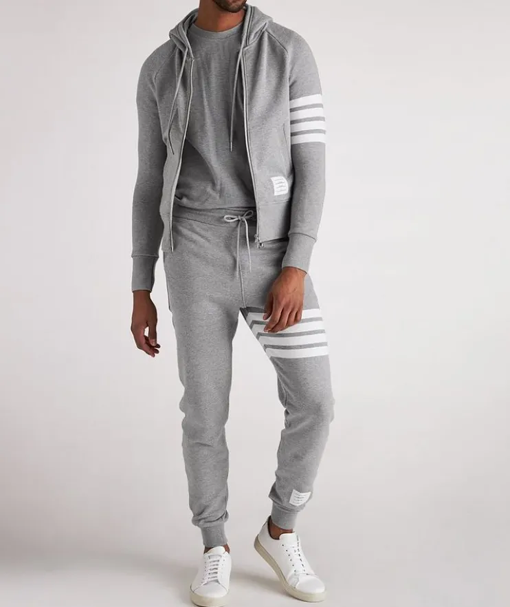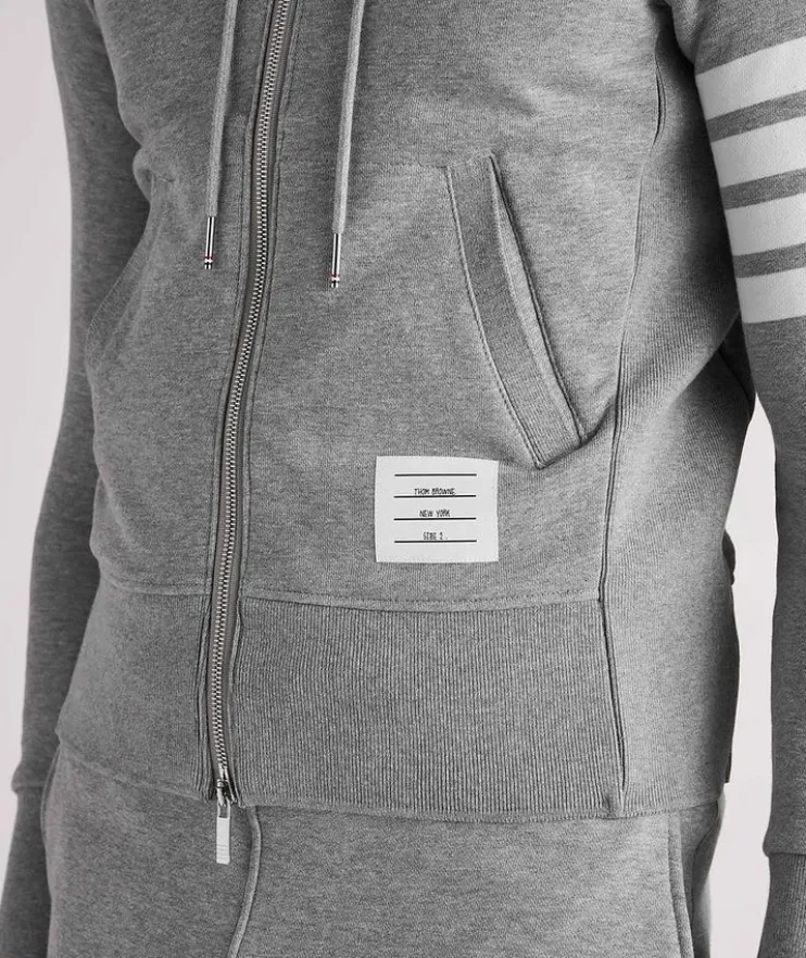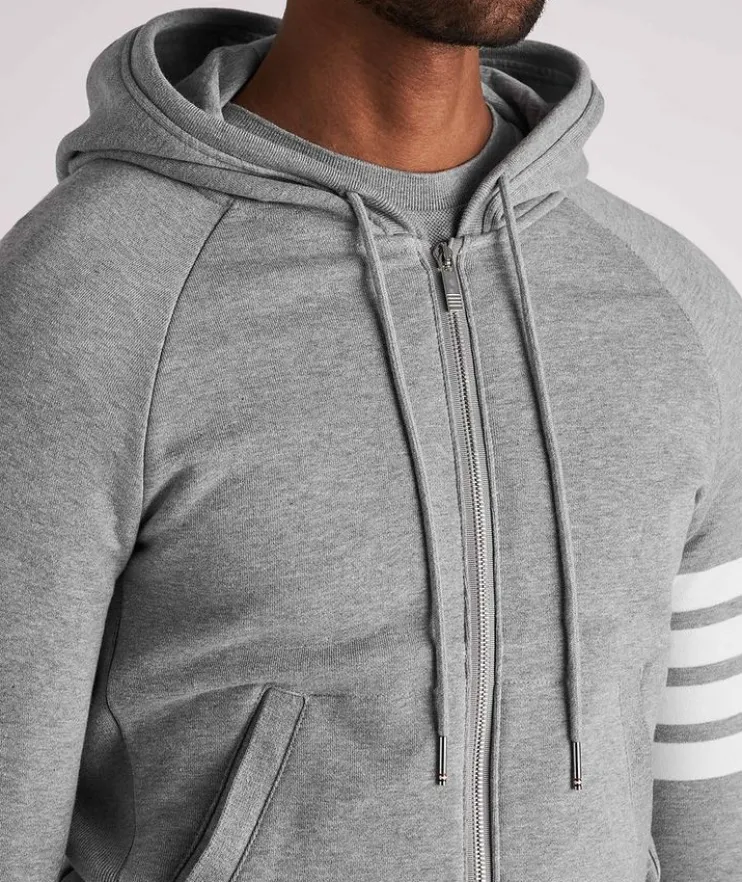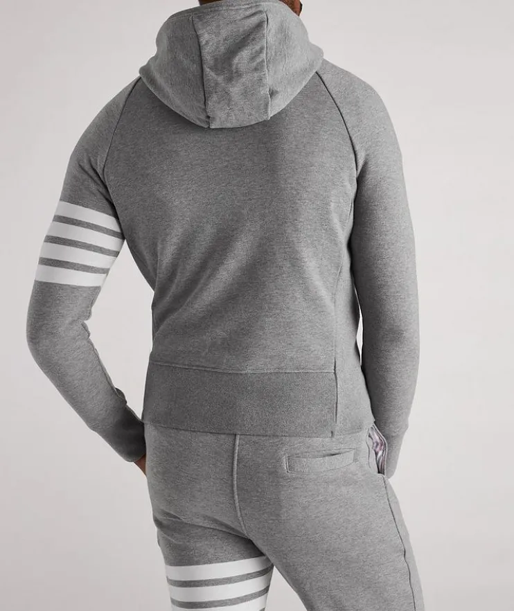 - This classic hooded sweater from Thom Browne is a decidedly elevated approach to off-duty attire. Crafted in Japan from pure cotton, it features the brand’s signature stripes on the left sleeve as well as their unique logo patch on the pocket. Sporty ribbed knit trims ensure a sharp silhouette. Layer the laid-back sweatshirt with a pair of complementing joggers.