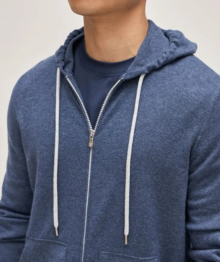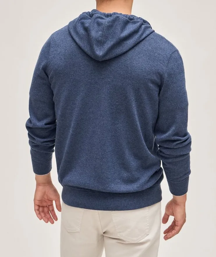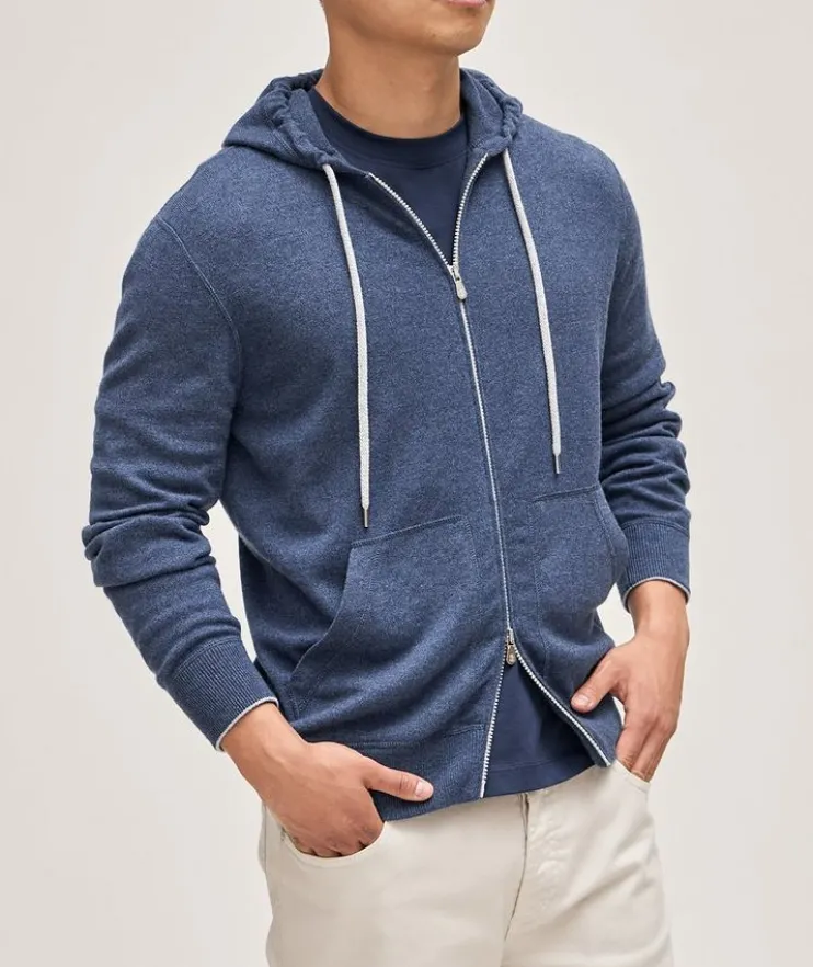 - For the the timeless gentlemen who is seeking the ultimate luxurious comfort and elegant casual style, indulge in this sumptuous cashmere hooded zip sweater for an elevated athleisure ensemble.