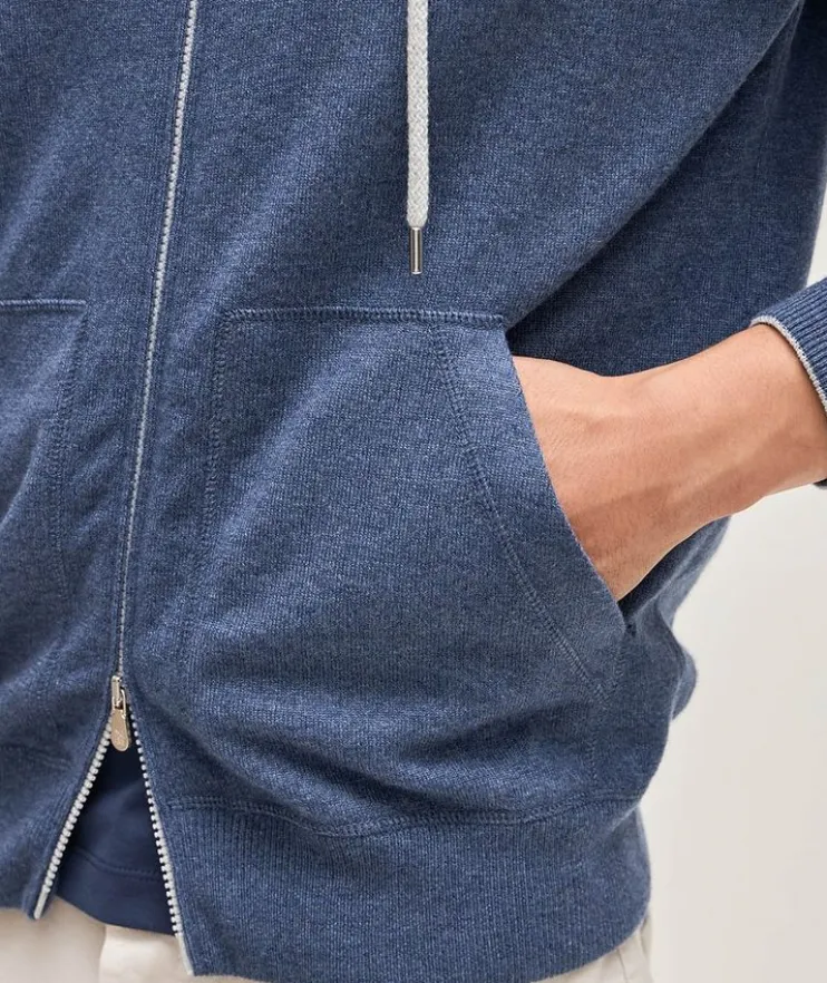 - Brunello Cucinelli’s full-zip cashmere hooded sweater is a versatile wardrobe essential that effortlessly blends comfort with sophistication. Whether wearing it with a pair laid back jeans or joggers, you can always layer it with a simple cotton t-shirt underneath for added warmth and style. This combination is perfect for leisurely brunches, casual outings, or relaxed weekends.